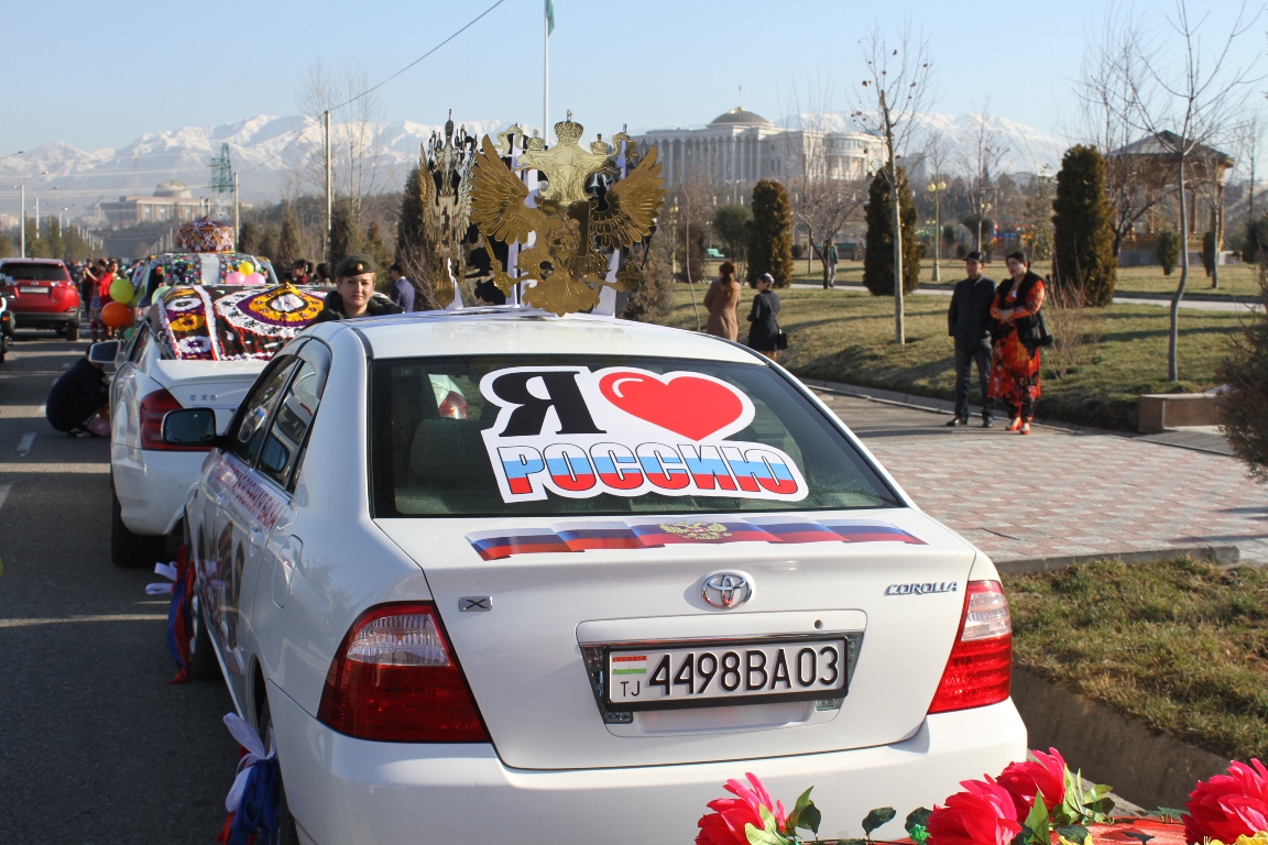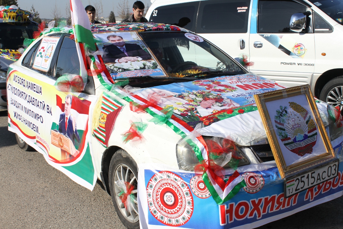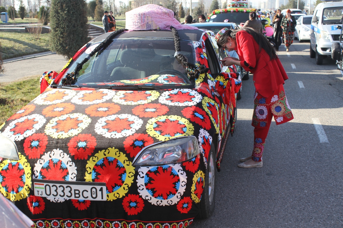 Свои автомобили они стилизуют под национальные костюмы, украшая крышу авто тюбетейками и плетеными косичками, к фарам приспосабливают огромные, бумажные ресницы, на бампер вешают тряпичные, алые губы. Впрочем, есть среди автомобилей и менее легкомысленные декорации. Например, Гульзода Тагоева из района Кубодиён превратила свою машину в настоящий агитационный автомобиль: на лобовом стекле со стороны пассажира – плакат Эмомали Рахмона, с обеих сторон – тоже, на заднем стекле – все шесть героев Таджикистана, есть здесь и герб, и конституция и флаг страны.