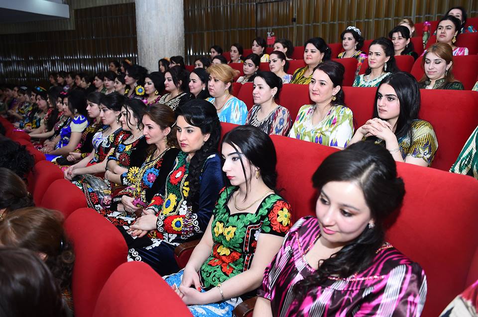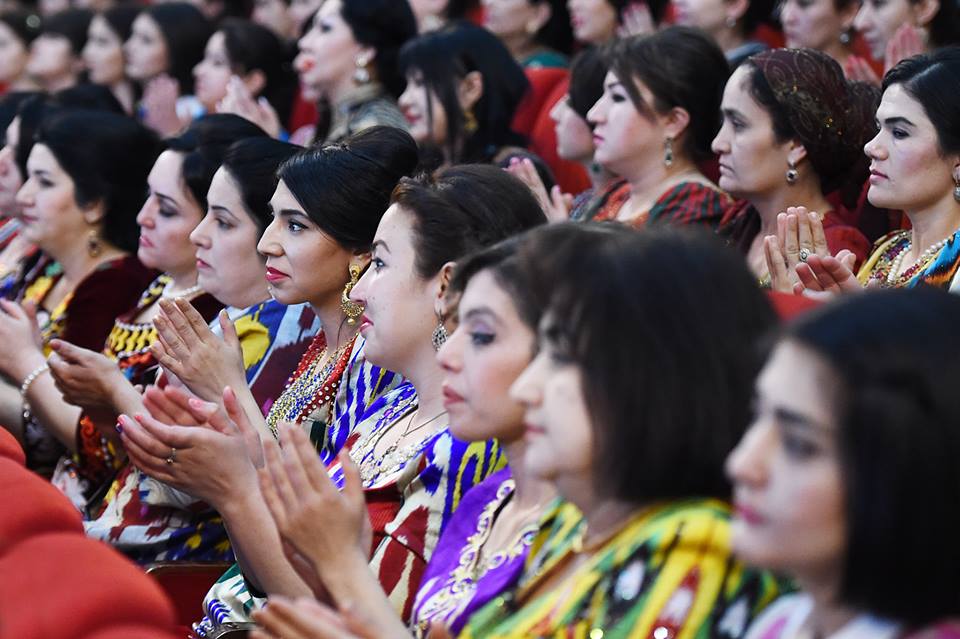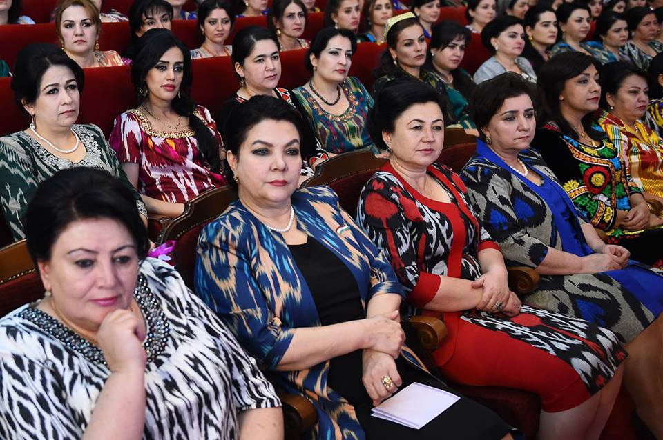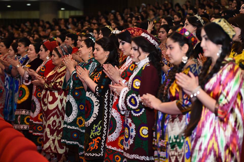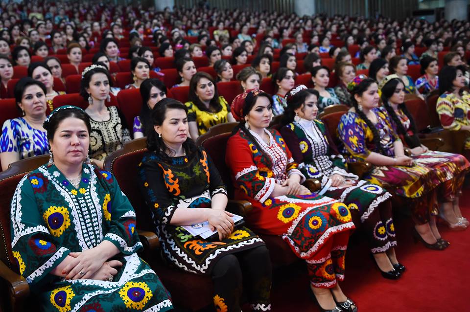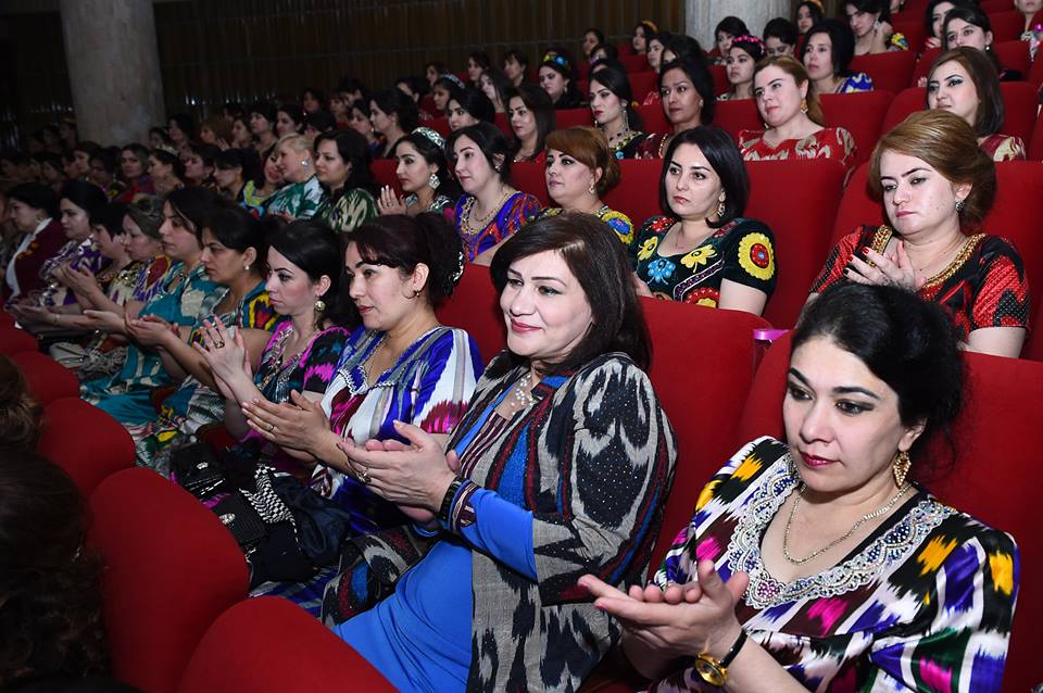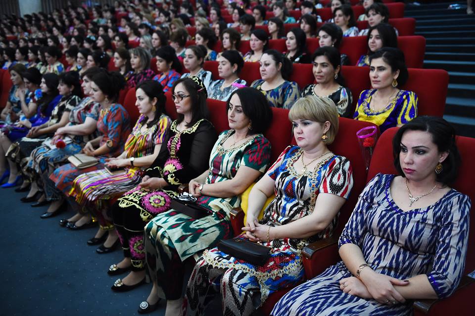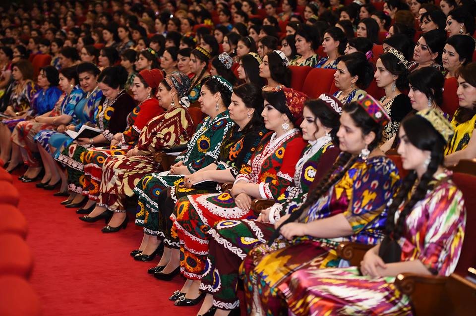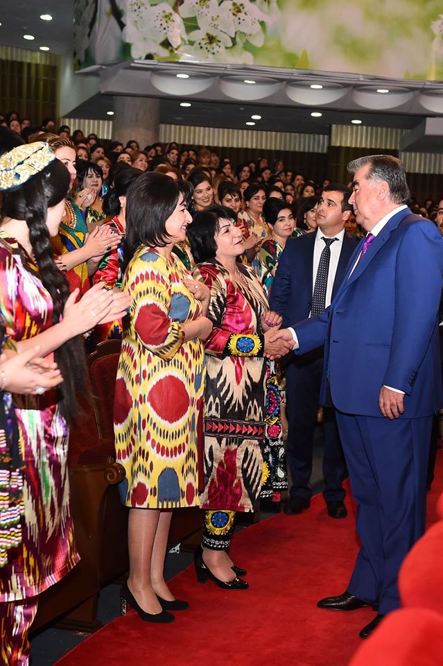 На встречу с президентом, которая прошла сегодня в Душанбе, таджикские активистки нарядились в национальные наряды – платья из адраса и атласа, а также с вышивкой чакан. Фото — пресс-служба президента РТ.