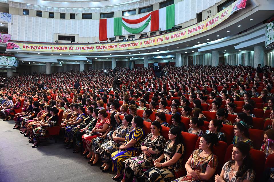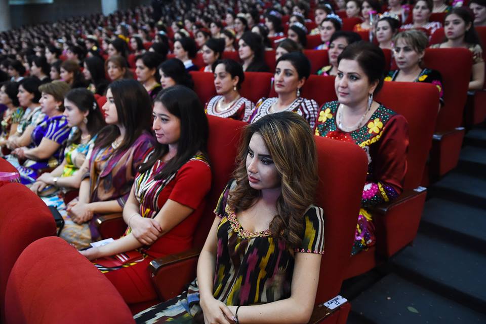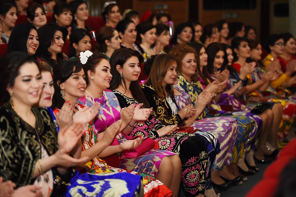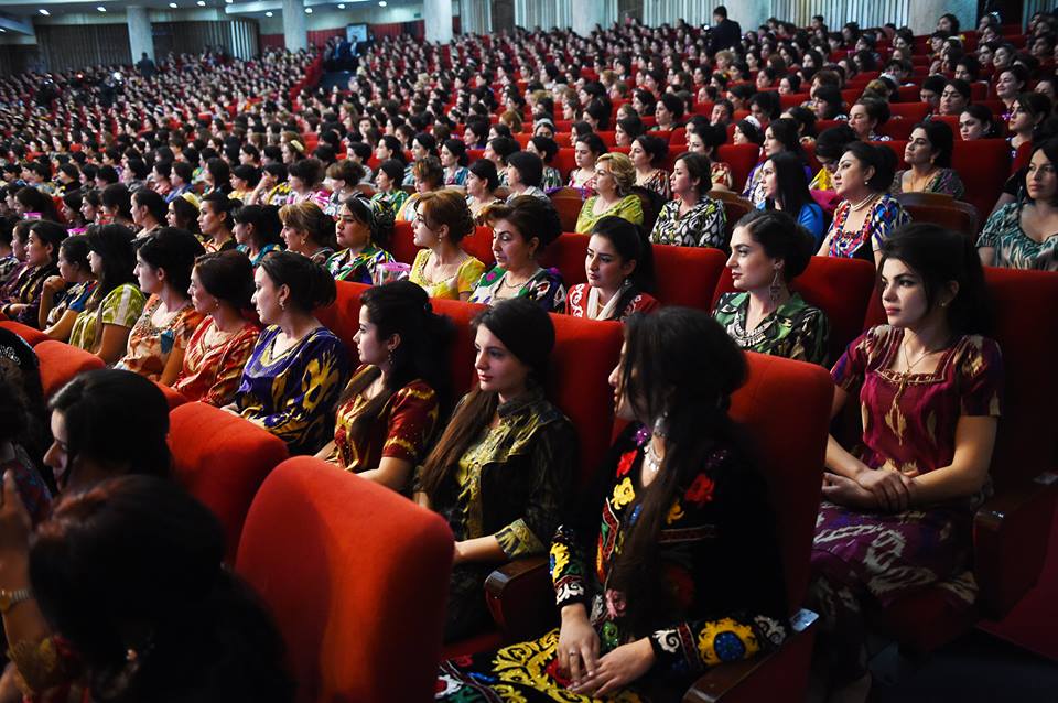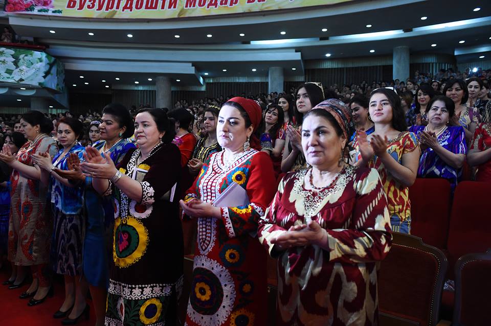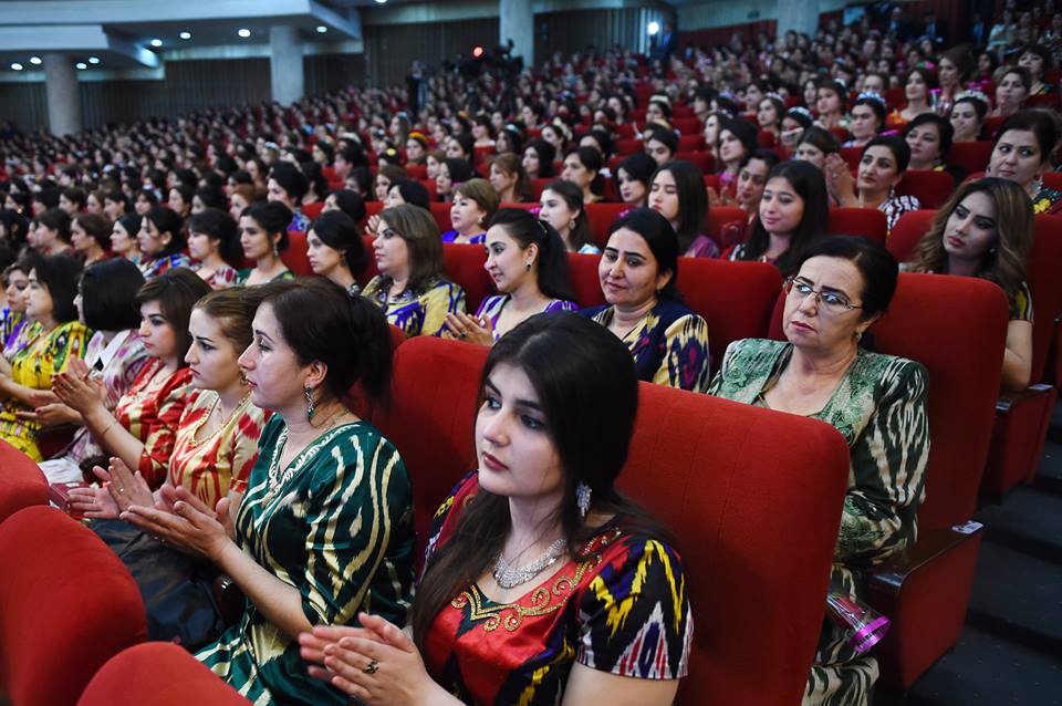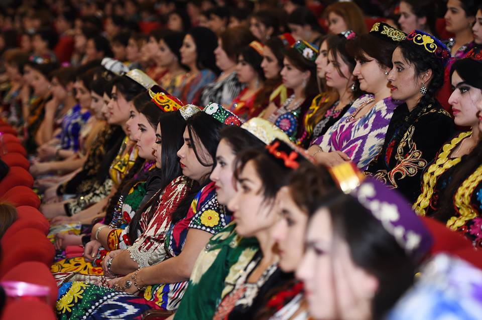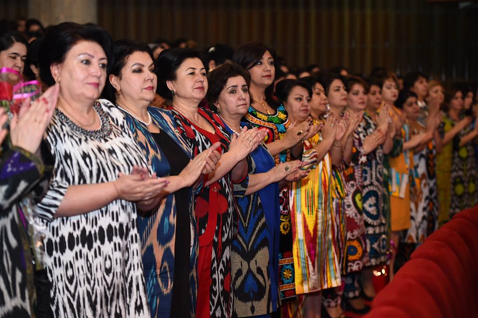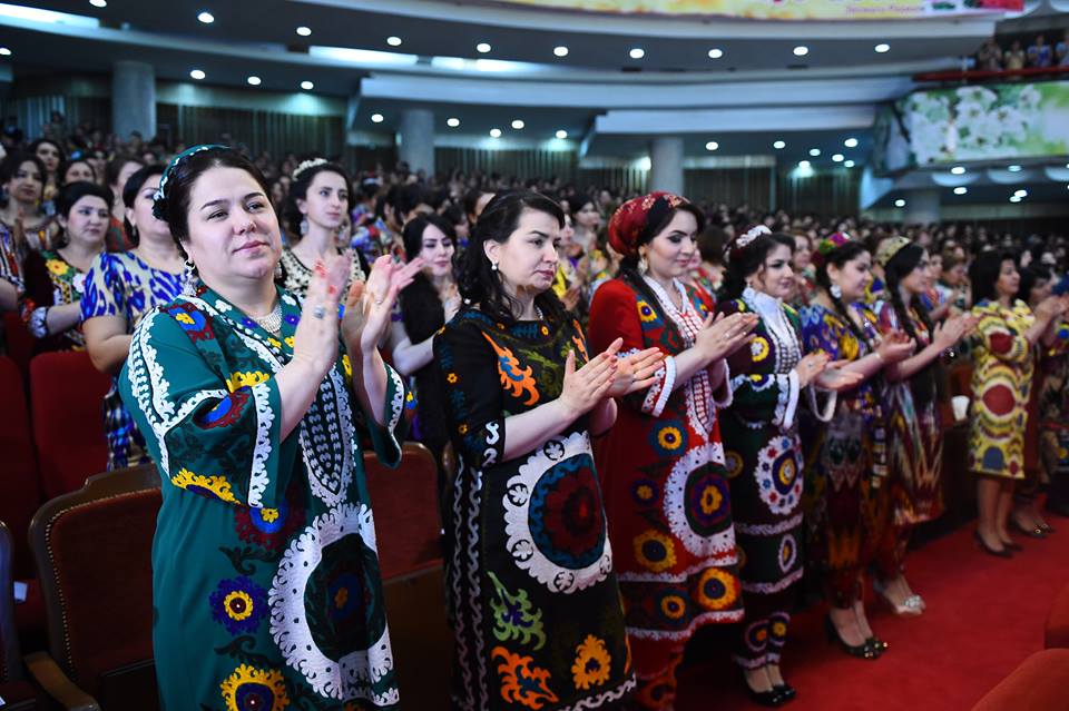 На встречу с президентом, которая прошла сегодня в Душанбе, таджикские активистки нарядились в национальные наряды – платья из адраса и атласа, а также с вышивкой чакан. Фото — пресс-служба президента РТ.