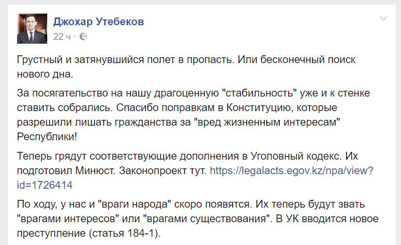 «В условиях так называемого «транзита власти» это такой обоюдоострый меч, что аж дух захватывает. А вдруг что-нибудь не так пойдёт? Тут даже не надо никакого революционного правосознания и народного трибунала?! Просто берётся старая статья и на рассвете приводится в исполнение, то есть применяется. Не создали ли разработчики поправок «угрозу существования и стабильному состоянию государства и общества?» Может пилотно к ним и применить? Ничего ведь нельзя исключать?! Кругом враги», — написал Айдан Карибжанов в своей хронике в Facebook.