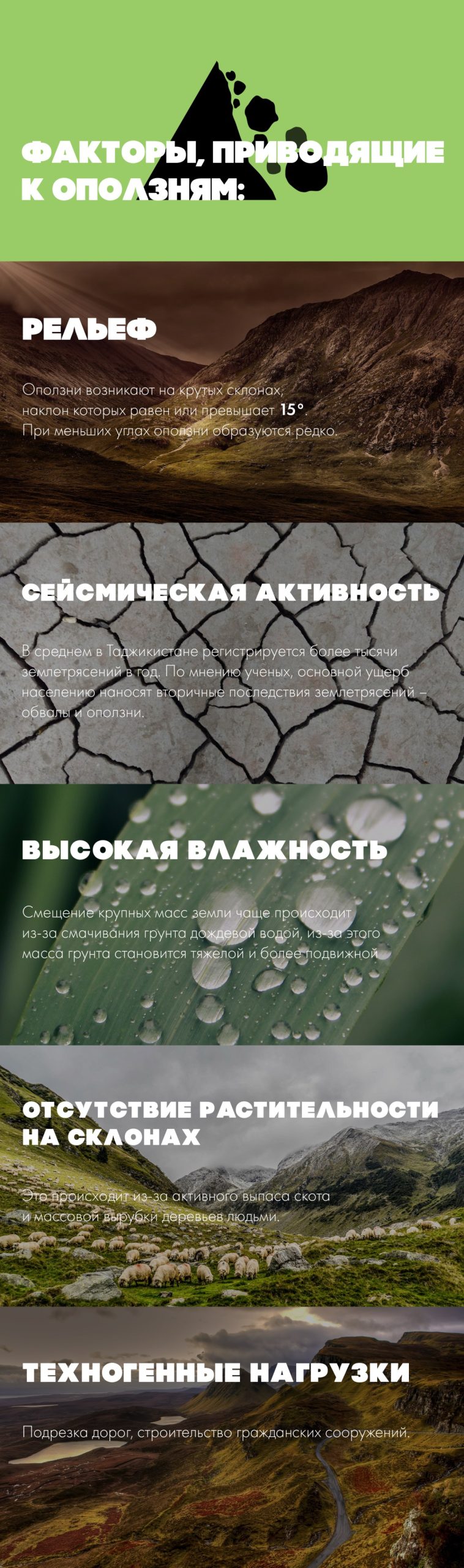 Советские ученые еще тогда выделили четыре зоны формирования оползней в Таджикистане: Гармскую группу районов (ныне называемая Раштской), Зерафшанскую долину, Западный Памир и Гиссарскую долину.