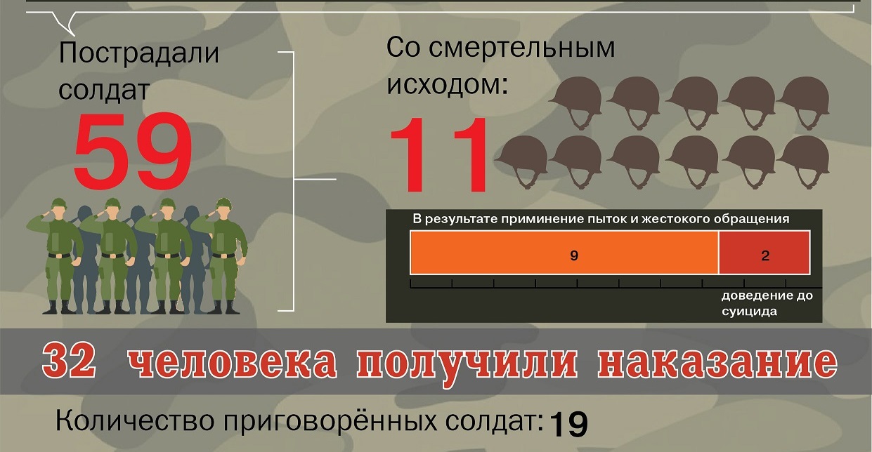 За два года жертвами дедовщины в таджикской армии стали около 60 солдат, сообщает Коалиция гражданского общества против пыток и безнаказанности. Наказание за неуставные отношения и пытки понесли всего 32 военнослужащих, 12 из которых были амнистированы. Подробнее смотрите в инфографике Коалиции против пыток.