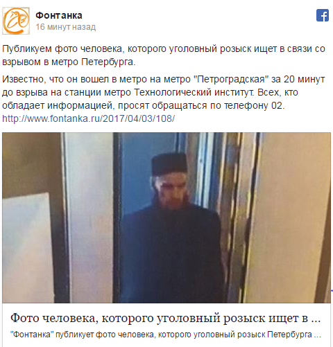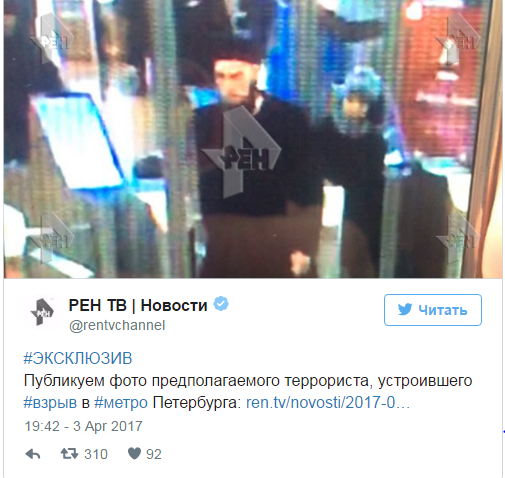 Телеканал РЕН также опубликовал снимок с камеры видеонаблюдения, на котором изображен предполагаемый исполнитель теракта в метро Санкт-Петербурга.