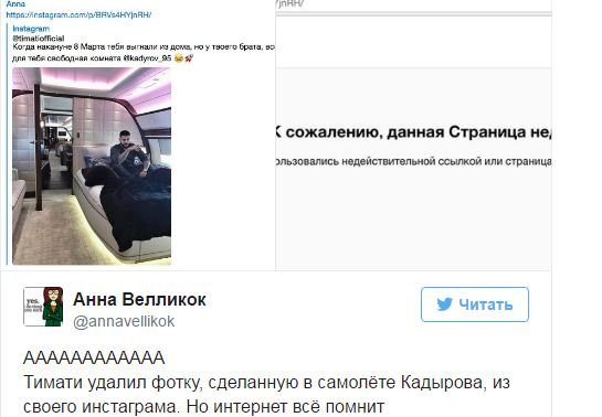 «Когда тебя выгнали из дома, но у твоего брата всегда есть для тебя свободная комната ))) @kadyrov_95», — написал Тимати.. Вскоре фотография была удалена, потом внезапно появиласьснова.