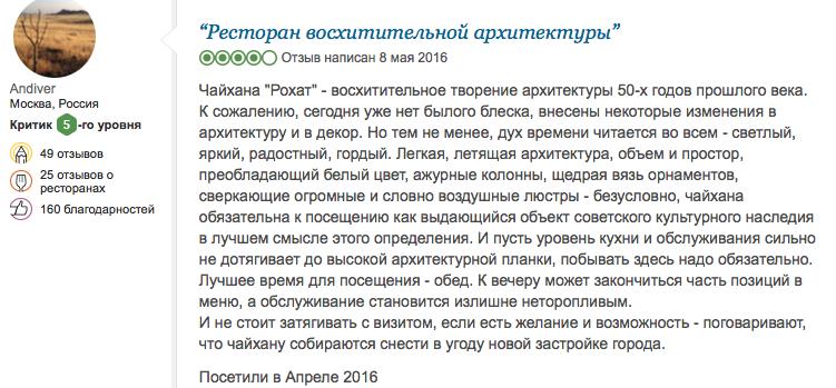 В этом, 2017 году, спустя более полувека, чайхана «Рохат» была названа «архитектурной жемчужиной» и вошла в список 11-ти лучших чайных домов мира, по версии американского телеканала CNN.