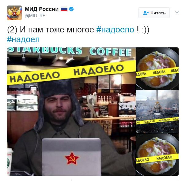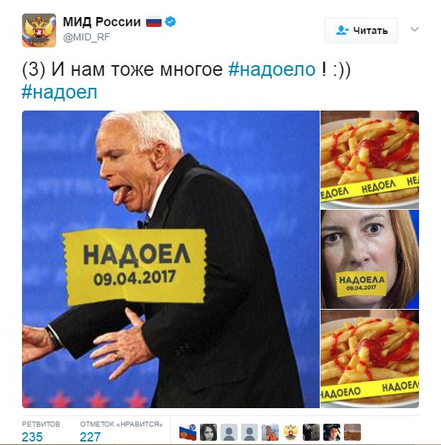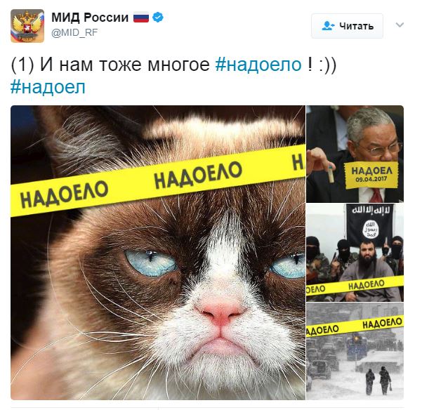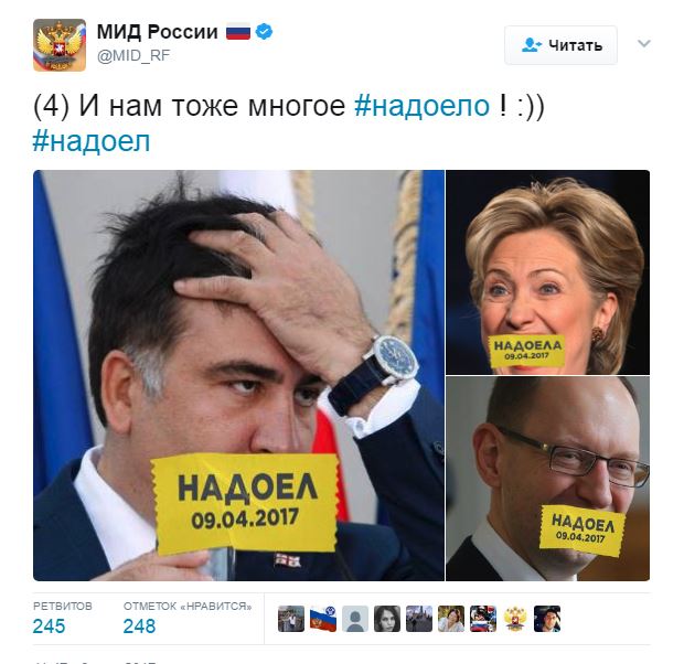 В официальном твиттере министерства иностранных дел России вечером 6 апреля появились несколько твитов с текстом «И нам тоже многое #надоело! :))» и коллажами с изображением зарубежных политиков, рты которых заклеены желтыми лентами со словами «надоел» или «надоела» и датой 09.04.2017, сообщает «Медуза».