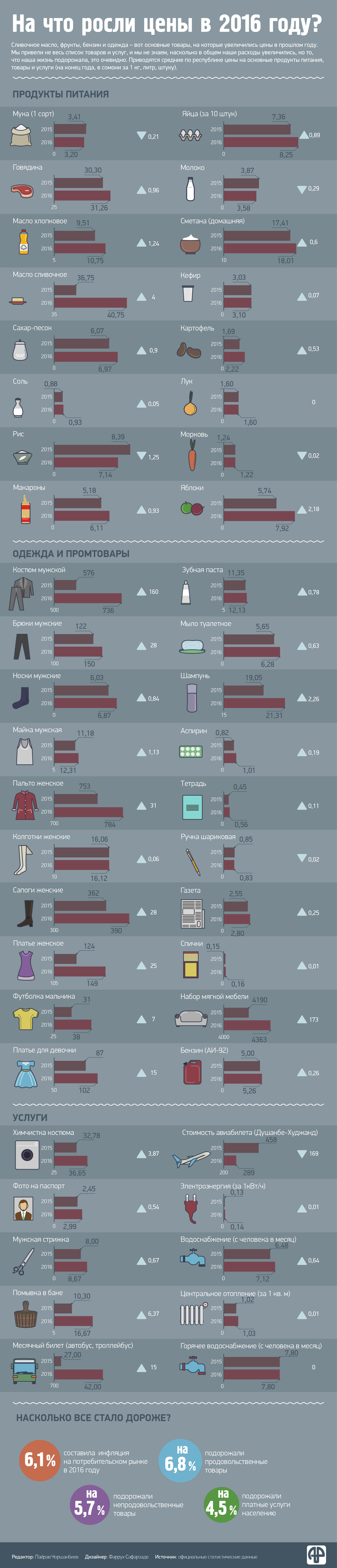В прошлом году в Таджикистане подорожали основные продукты питания и одежда. В цене росли даже те, которые производятся в самой республике. Что и на сколько ударило по нашему карману, смотрите в инфографике «Азия-Плюс».
