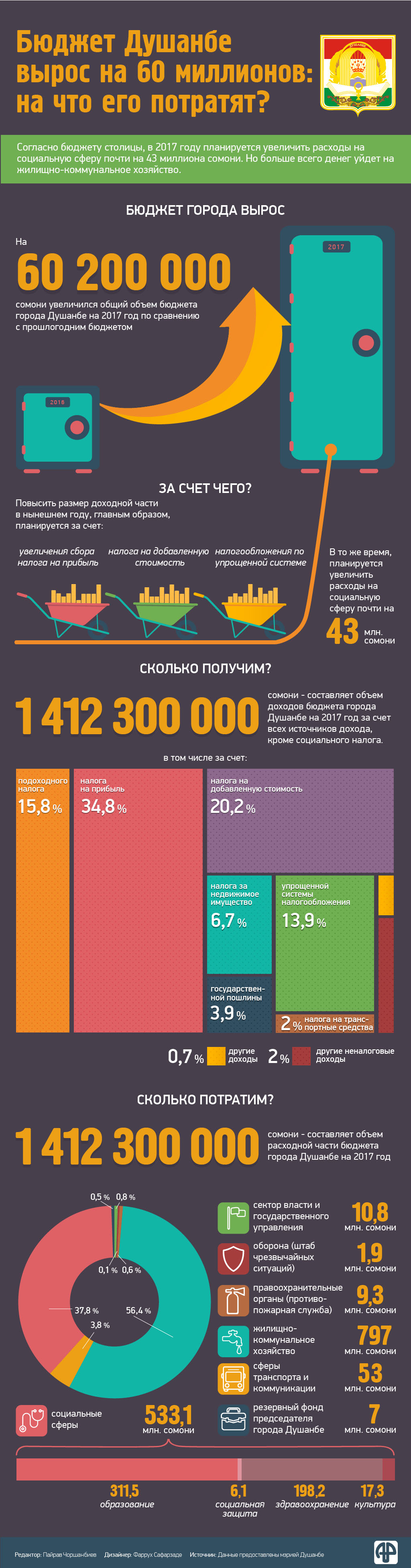 Стоит напомнить, что бюджет столицы Таджикистана в этом году увеличен на 60 миллионов сомони. Увеличить доходную часть планируется за счет сбора налогов. При этом расходная часть бюджета увеличена на 43 миллиона. На что пойдут эти средства, смотрите в нашей инфографике.