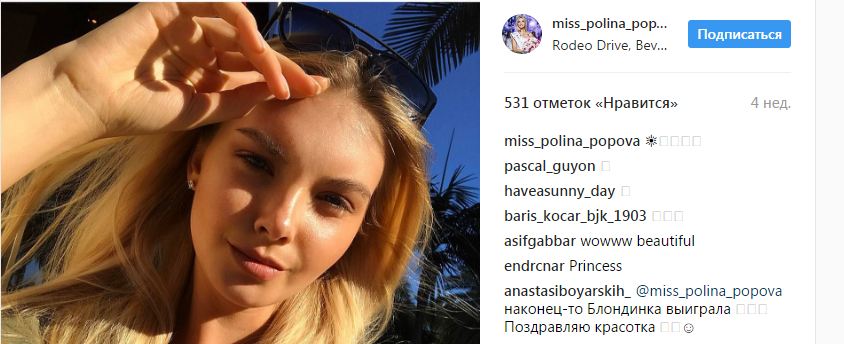Победительницей конкурса «Мисс Россия — 2017» стала 21-летняя представительница Свердловской области Полина Попова. Ей досталась корона стоимостью $1 млн и право представлять Россию на конкурсах «Мисс Мира» и «Мисс Вселенная».