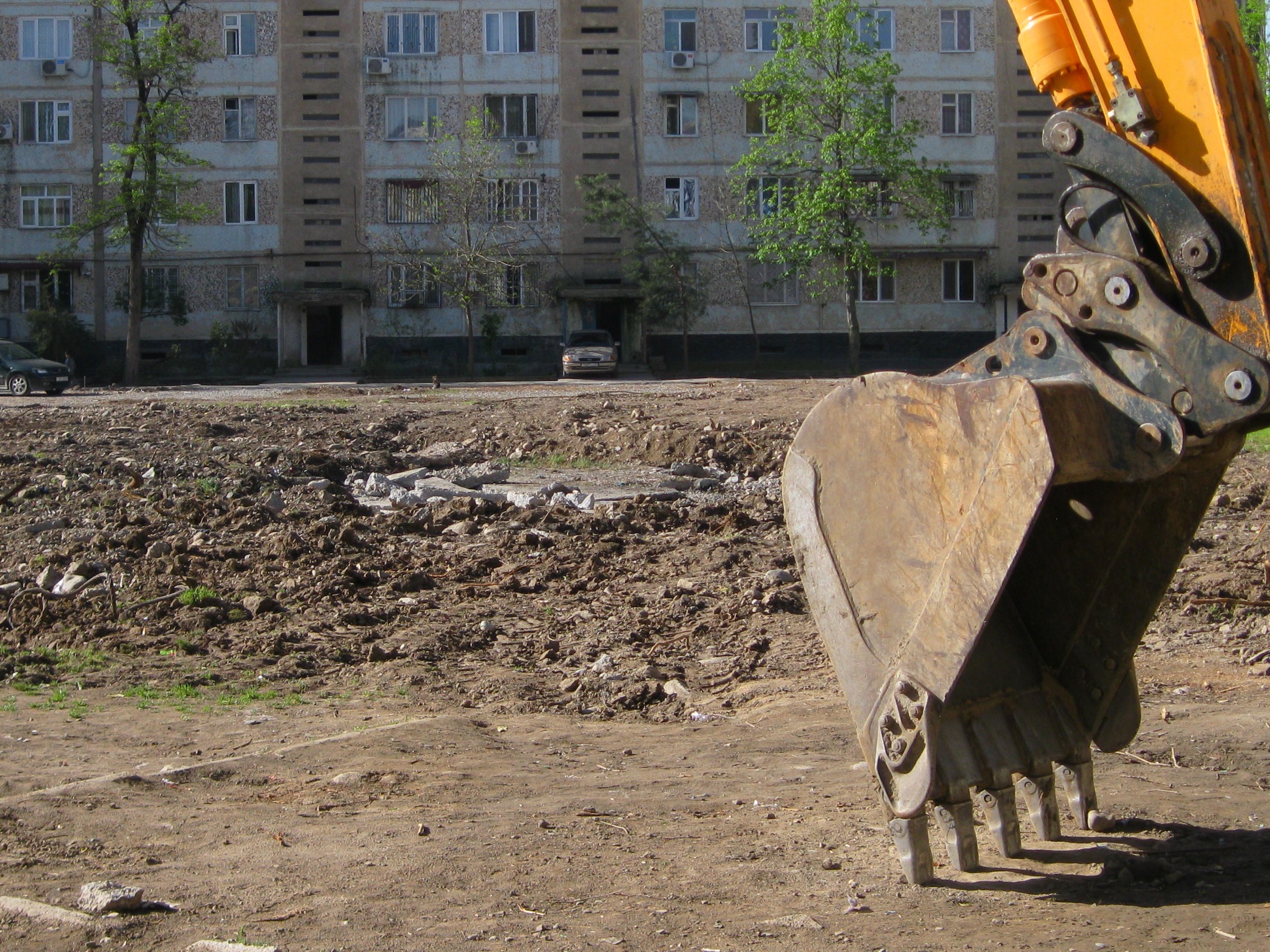 И вот начался ремонт внутренних дорог. Жители радовались, видя, как разбитые трассы превращаются в гладкие дороги. Оказалось, что благоустройство микрорайона включает в себя также строительство спортивных и детских площадок. Вроде и радоваться надо. Вот только работы начались с разрушения небольшого бассейна, пешеходных дорожек и вырубки немногих сохранившихся деревьев, растущих вокруг. Были вырублены и деревья, растущие поодаль, вплотную к придомовым аллеям. Мощные стволы 40-летних деревьев вывозились, а ветви разрешалось забрать жителям близлежащих домов для тандыров.