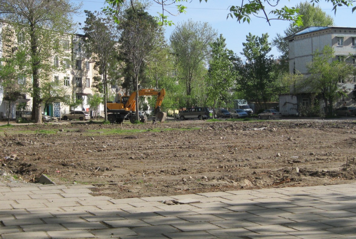 И вот начался ремонт внутренних дорог. Жители радовались, видя, как разбитые трассы превращаются в гладкие дороги. Оказалось, что благоустройство микрорайона включает в себя также строительство спортивных и детских площадок. Вроде и радоваться надо. Вот только работы начались с разрушения небольшого бассейна, пешеходных дорожек и вырубки немногих сохранившихся деревьев, растущих вокруг. Были вырублены и деревья, растущие поодаль, вплотную к придомовым аллеям. Мощные стволы 40-летних деревьев вывозились, а ветви разрешалось забрать жителям близлежащих домов для тандыров.