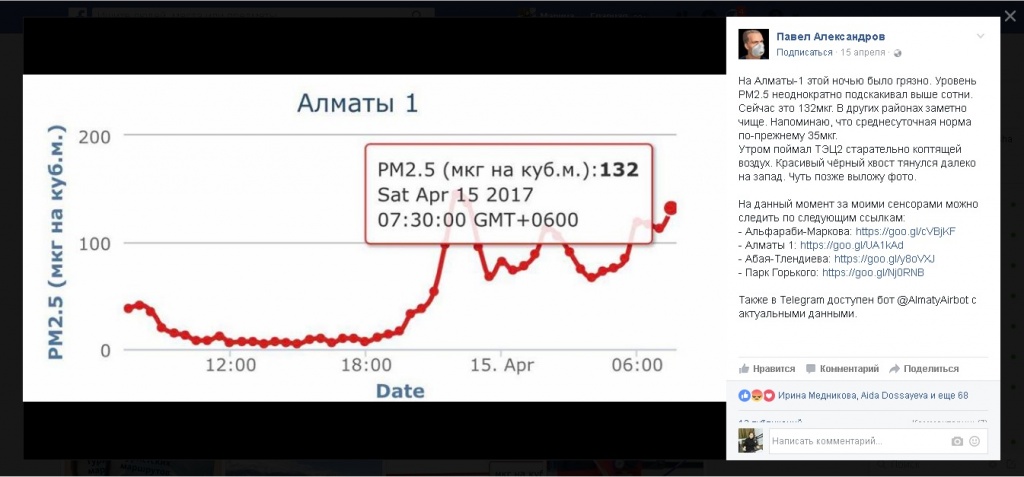 Ещё один набирающий обороты казахстанский проект живёт в Фейсбуке и называется «Воздух Алматы». Простой горожанин – не эколог, не географ – Павел Александров замеряет «атмосферу» южной столицы и делится этими знаниями со всеми.