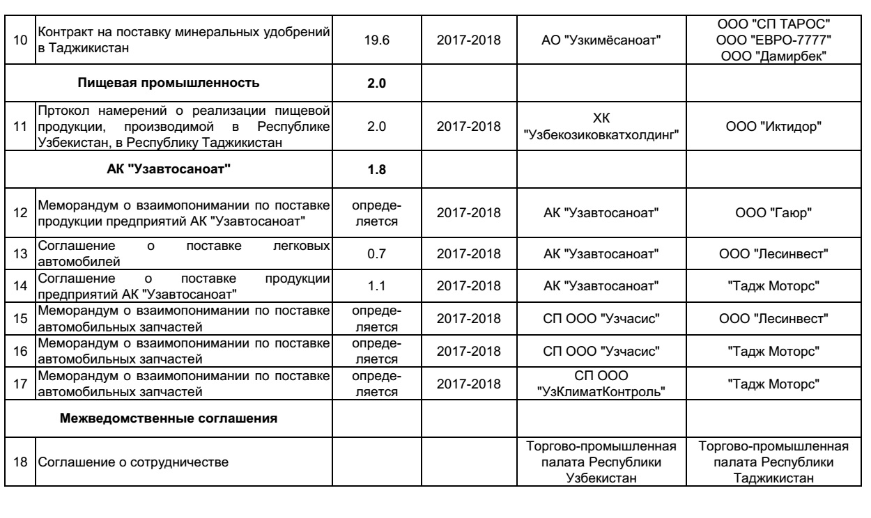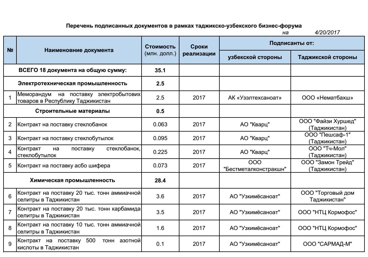 Также подписан Протокол намерений о реализации в Таджикистане узбекской пищевой продукции. Подписанный между компанией «Узбекозиковкатхолдинг» и таджикской компанией «Иктидор» контракт на сумму 2 миллиона долларов подразумевает сотрудничество на 2017-2018 годы.