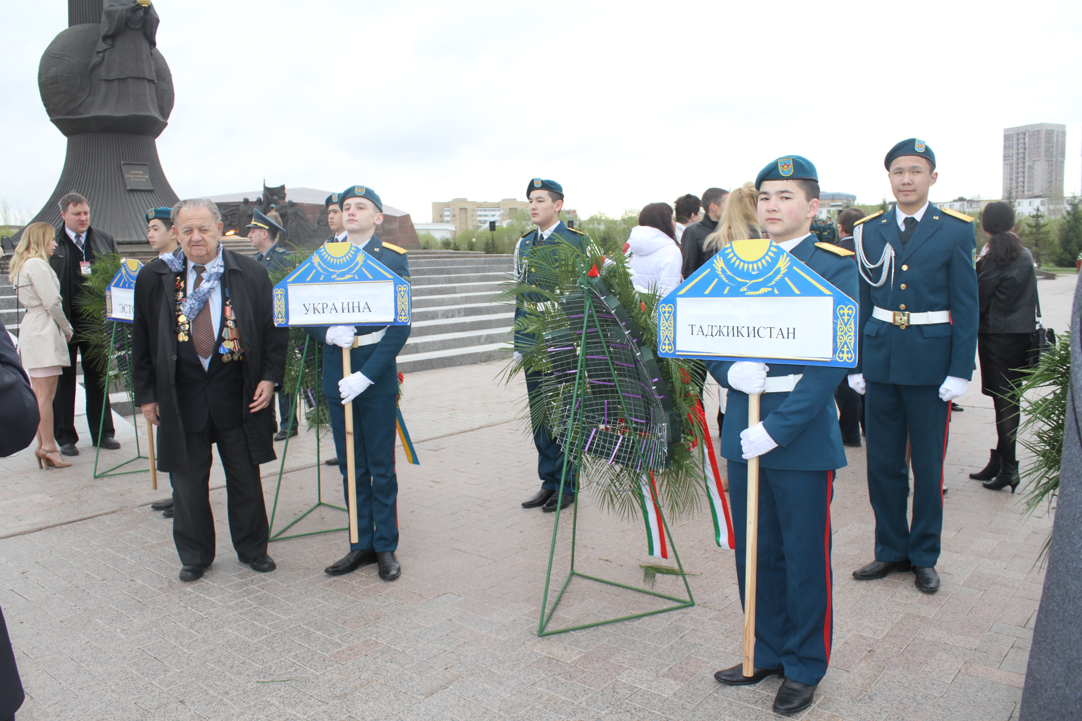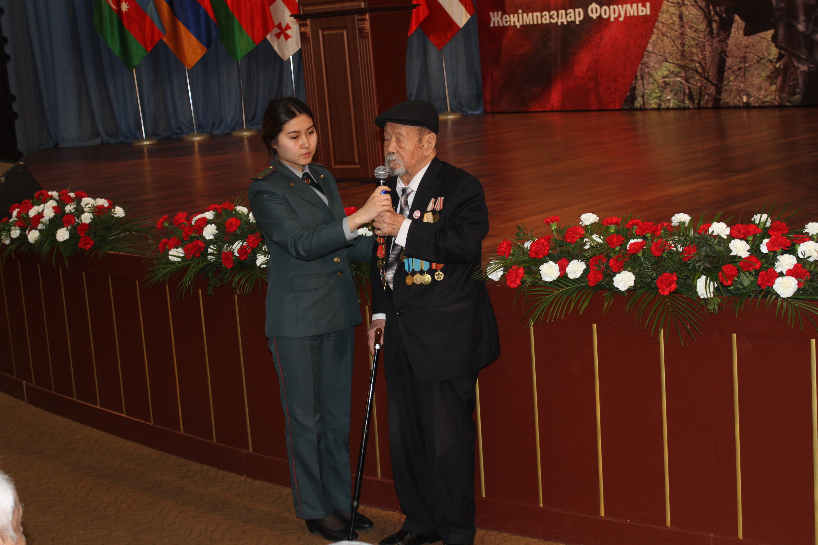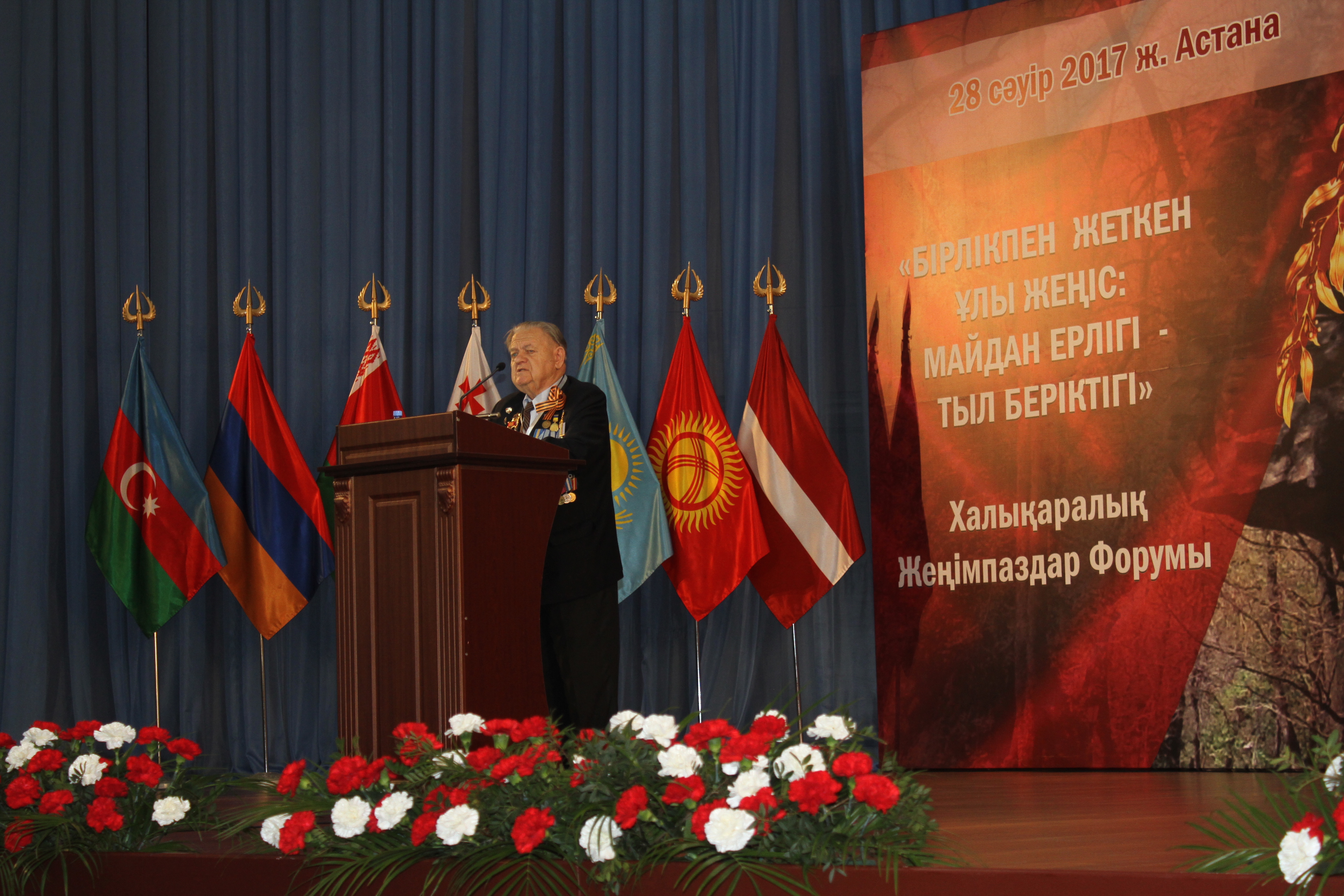В нескольких делегациях были и ветераны ВОВ; поддерживаемые под руку сопровождающими, они старались держать военную выправку и успевать за строем остальных. Увы, на это мероприятие смогли приехать только шесть участников ВОВ. Всего же в столицу Казахстана на форум прибыли 250 делегатов.