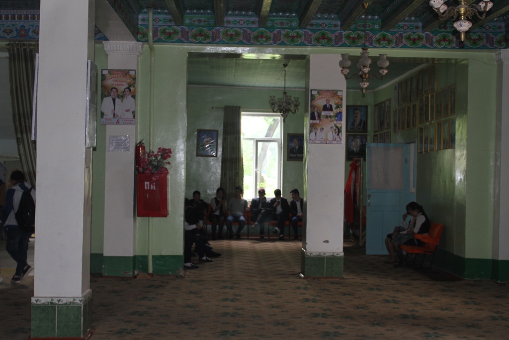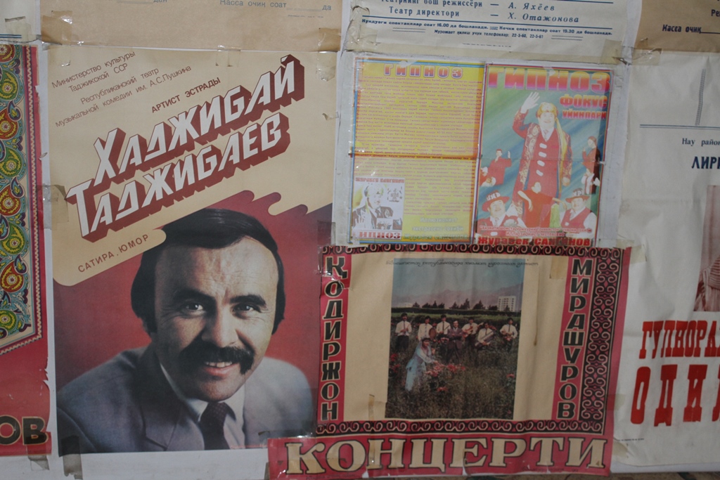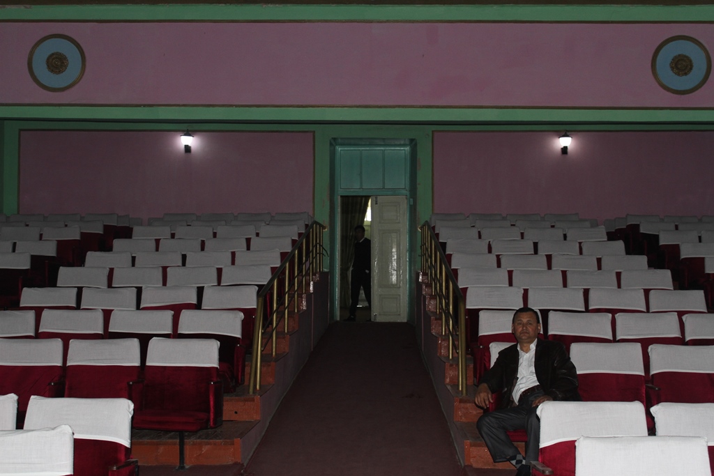 Абдукадыр Кахарович устраивает нам маленькую экскурсию по зданию, показывает прошлые афиши, которые хранятся в холле театра не один десяток лет, аккуратный, хоть и старенький, зрительный зал, низкую сцену, застеленную белой тканью.