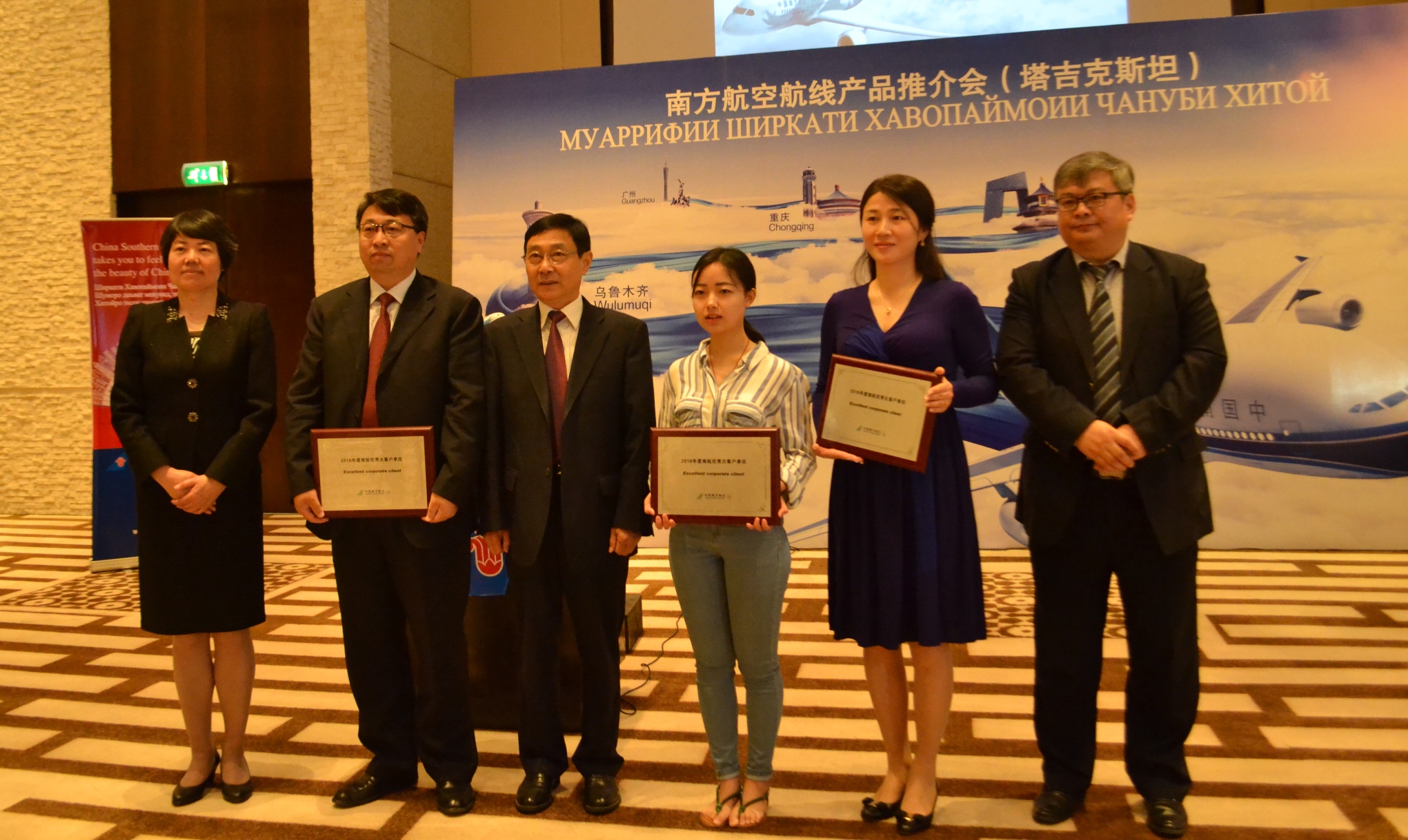По окончанию официальной приветственной части представители ООО «Южной Авиакомпании Китая» в Душанбе тепло поблагодарили своих корпоративных клиентов, благодаря поддержке которых они развиваются и для которых они работают. В качестве благодарности некоторые из них, а именно филиал компании TGP, Институт Конфуция при ТНУ, компания «Хуасинь Гаюр Цемент» — были удостоены памятных грамот за 2016 год.