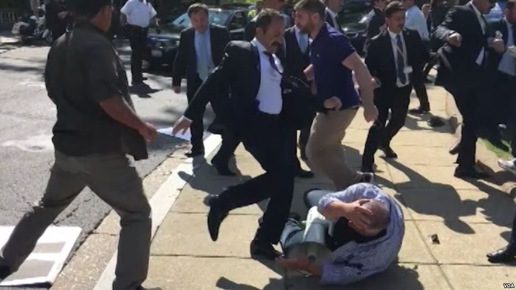Около десяти человек получили травмы и доставлены в больницу, один находится в критическом состоянии. После драки арестованы два человека, одному из них предъявлено обвинение в нападении на сотрудника полиции. Есть ли среди задержанных охрана Эрдогана, не уточняется.