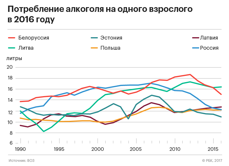 Россия вместе с Польшей расположились на четвертой строчке с показателем чуть более 12 л на каждого жителя.