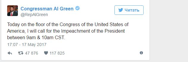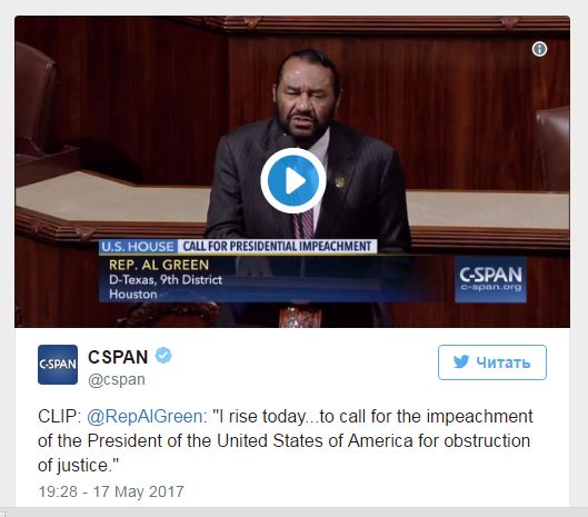 На этом фоне Эл Грин, конгрессмен-демократ от штата Техас, 17 мая с трибуны заявил о готовности инициировать импичмент против Трампа.