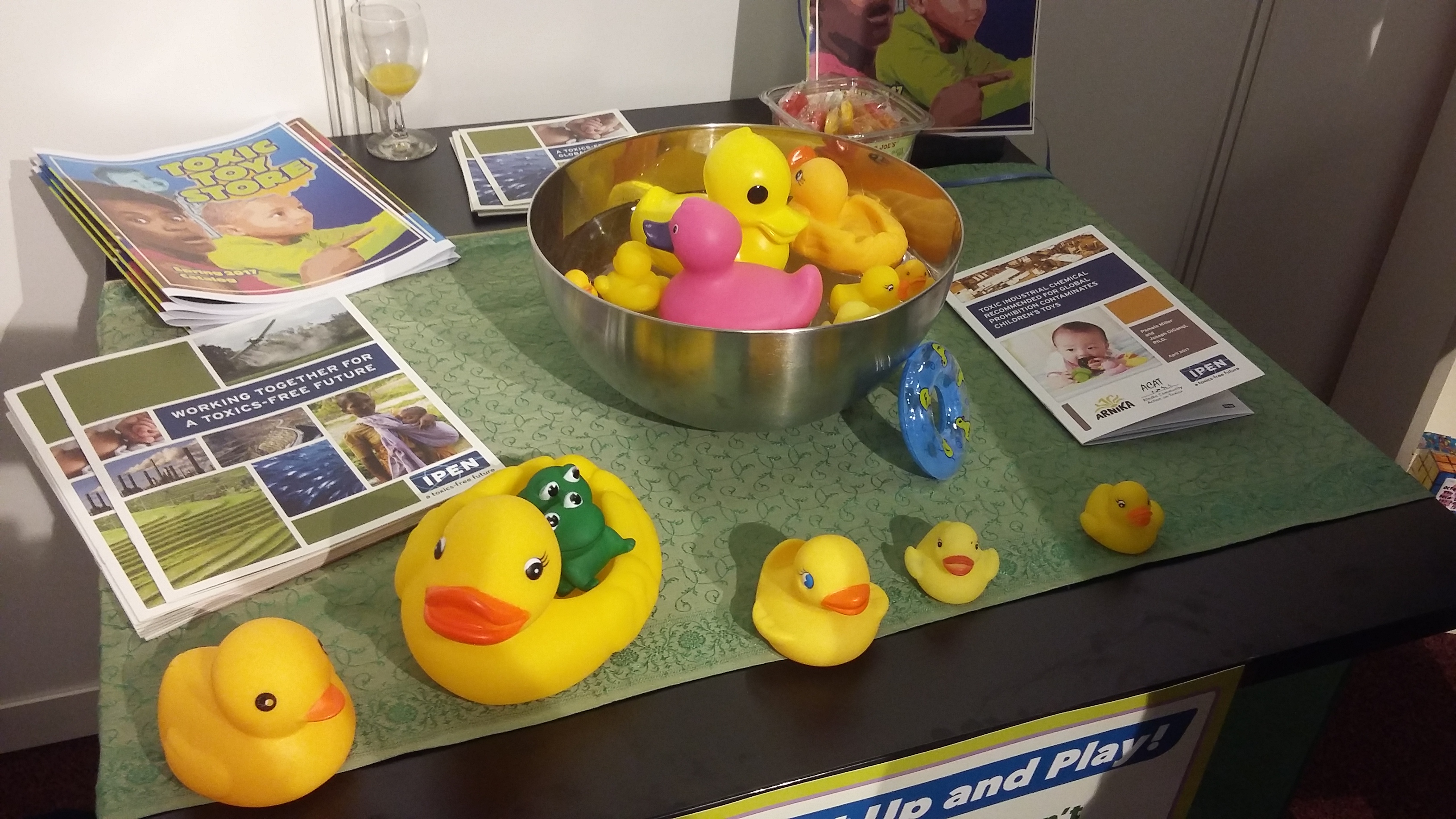 «На конференции сторон  по Стокгольмской конвенции, было принято решение включить два токсичных химических вещества под юрисдикцию конвенции. Однако одновременно с этим решением, правительства разрешают их использование!, — говорится в официальном пресс-релизе IPEN, — Химические вещества включают дека-бромодифенил эфир – антипирен, которые обычно обнаруживается в электронных отходах,  а также хлорированные парафины с короткой цепью – промышленный химикат, который применяется в качестве смазки при обработке металлов резанием, а также как антипирены в пластике на основе ПВХ, в резине и в ковровых покрытиях. Другие виды применения включают использование в качестве пластификаторов в красках, клеях и герметиках. Оба химиката обладают высокой токсичностью, длительное время не разлагаются в окружающей среде, способны перемещаться на большие расстояния и накапливаться в пищевых цепях. Недавнее исследование IPEN подтверждает их присутствие в игрушках для детей».