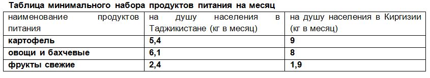 По расчетам специалистов НИИ по вопросам питания Минздрава и Института питания Минэнергопрома РТ, минимальная потребность таджикистанцев в картофеле составляет 5,4 кг/месяц, фруктов свежих — 2,4 кг/м, бахчевых и овощей – около 6,1 кг/м. Данные взяты из таджикского стандарта потребительской корзины, утвержденной постановлением правительства в конце 2012 г. (№775). Наши читатели могут сами решить, насколько реальны эти цифры. Мы же отметим, что это количество значительно ниже, чем в стандартах соседних странах.