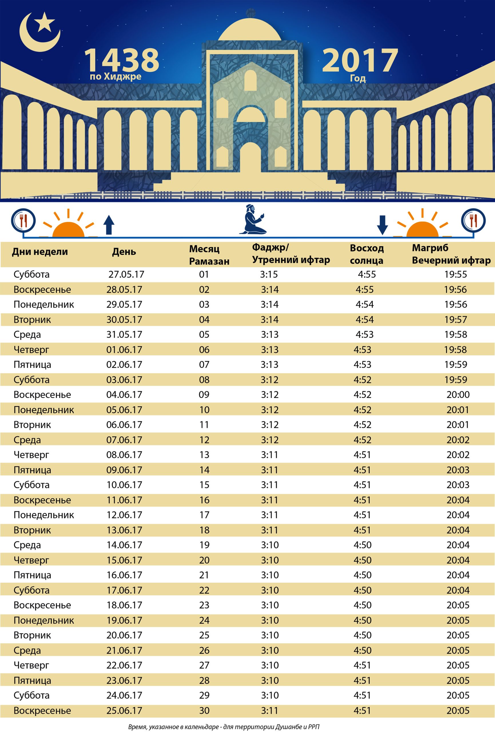 В какое время во время поста жителям Душанбе и РРП будет разрешено начинать принимать пищу вечером и когда утром нужно закрывать дастархан, смотрите в календаре. Чтобы просмотреть и распечатать календарь, перейдите по ссылке.