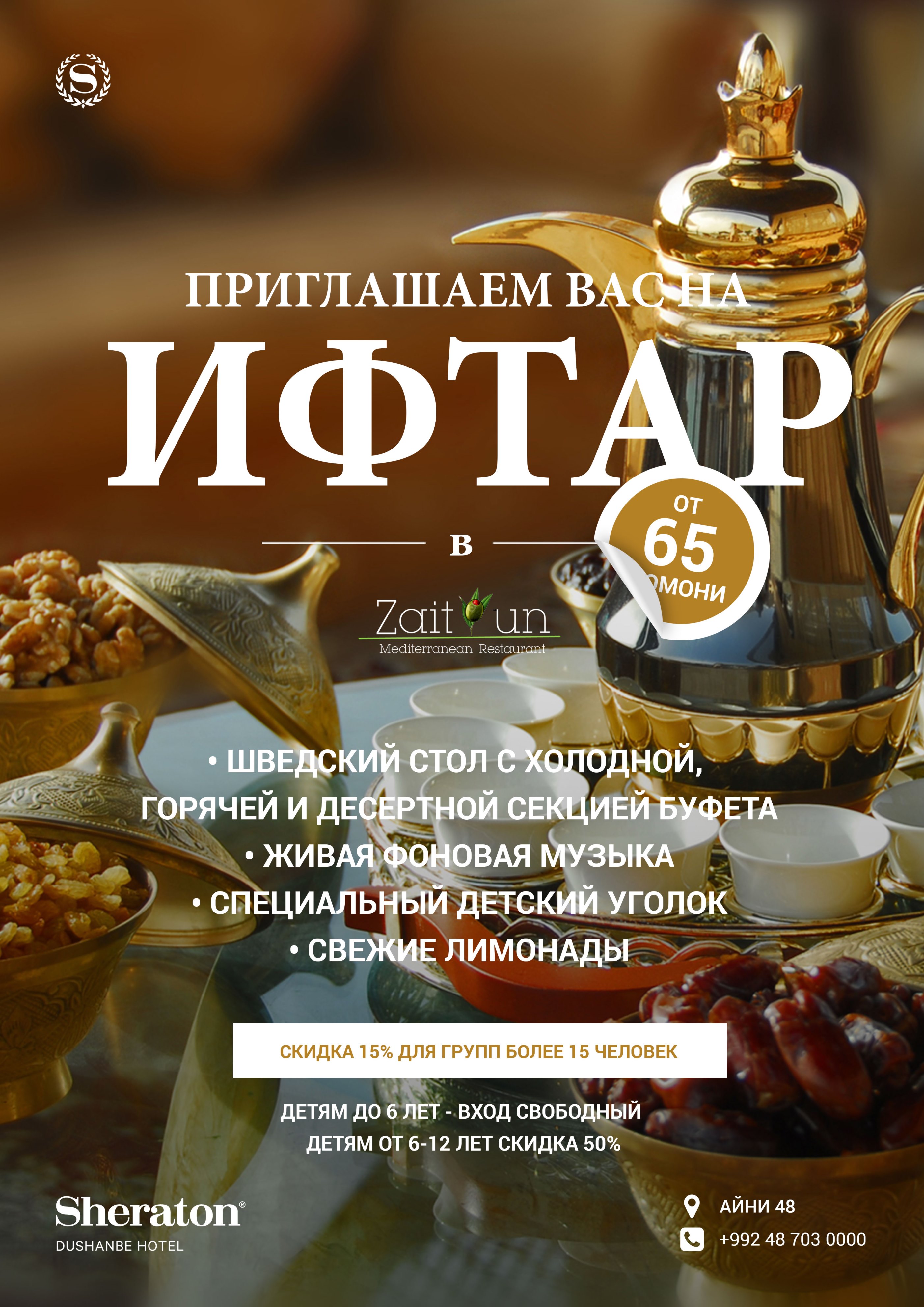 Ресторан «Зайтун» в отеле «Шератон Душанбе» приглашает на ифтор. Вас здесь ждет шведский стол с холодной, горячей и десертной секцией буфета, свежие лимонады. Для детей здесь также созданы особые условия – есть специальный детский уголок, свободный вход для детей до 6 лет, после 6 лет предусмотрена 50-процентная скидка.