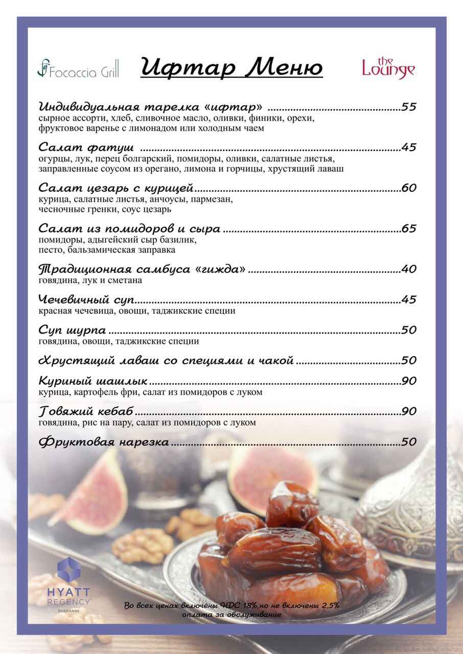 Разнообразное меню на ифтор вам предложат в ресторане гостиницы Hyatt Regency Dushanbe. Здесь каждому для открытия уразы предложат индивидуальную тарелку, на которой будет сырное ассорти, хлеб, сливочное масло, оливки, финики, орехи. Также вам обязательно подадут фруктовое варенье с лимонадом или холодным чаем.