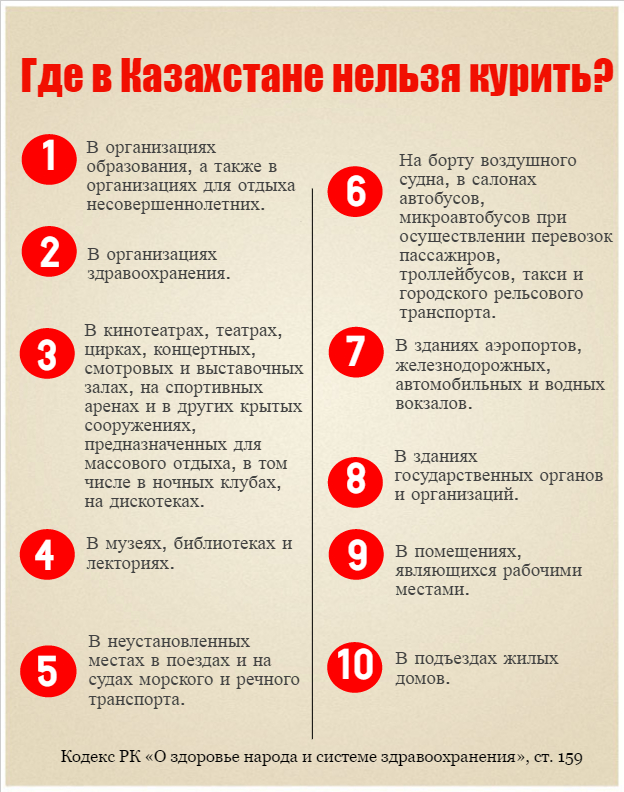 Борьба с курильщиками началась в Казахстане в 2009 году. Тогда в республике был принят новый Кодекс о здоровье народа, в котором статья 159 ограничила употребление табака в общественных местах. Другая статья – 441, уже в Административном кодексе, предусматривает за это наказание в виде штрафов для физических лиц: от $21 – за разовое нарушение и до $42 в случае рецидива; от $70 для должностных лиц, дымящих в неположенном месте, до $420 – если виновато юридическое лицо.