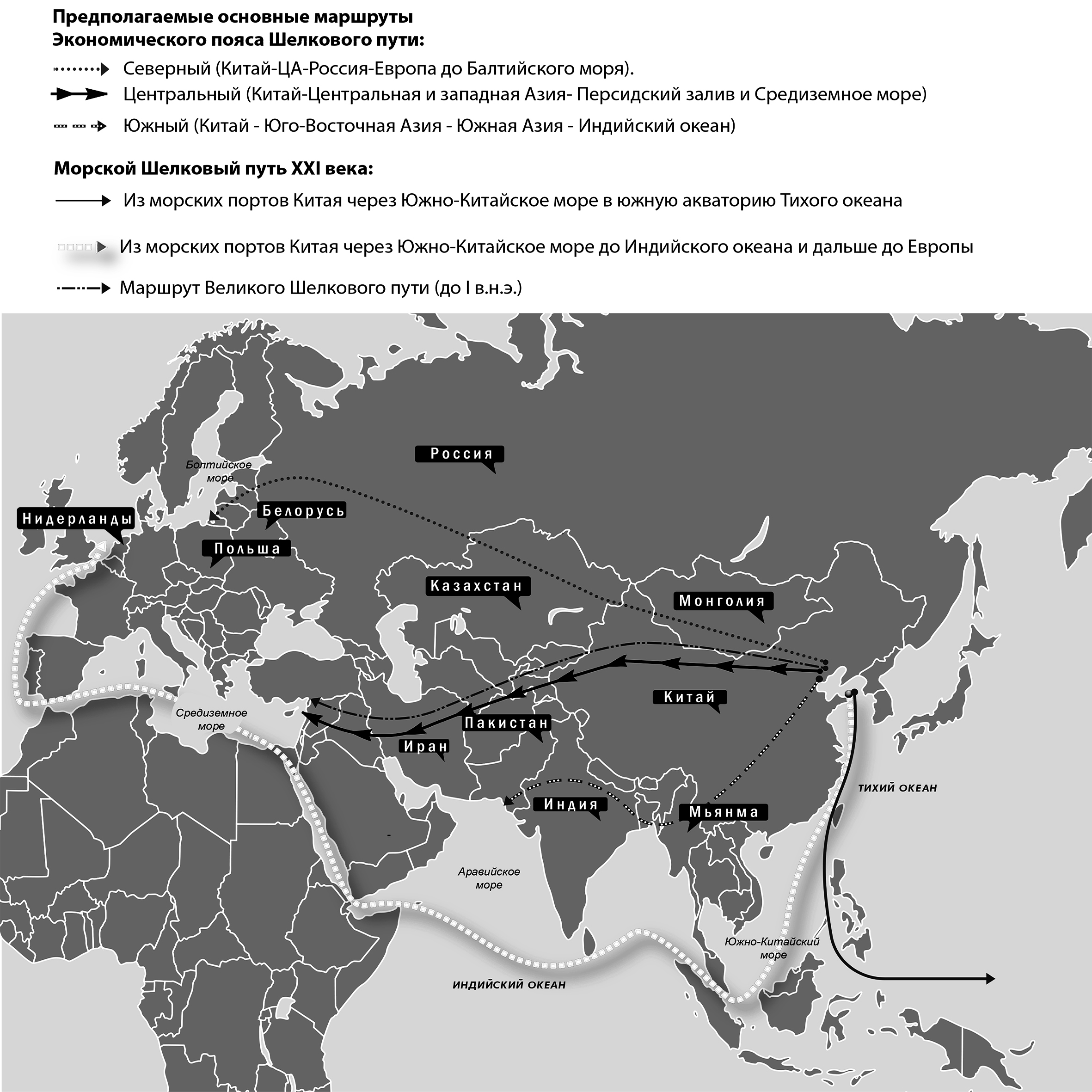 Стратегия включает два ключевых направления развития: экономический пояс Шелкового пути и морской Шелковый путь. Речь идет о создании торгового коридора для прямых поставок товаров с Востока на Запад на льготных условиях.