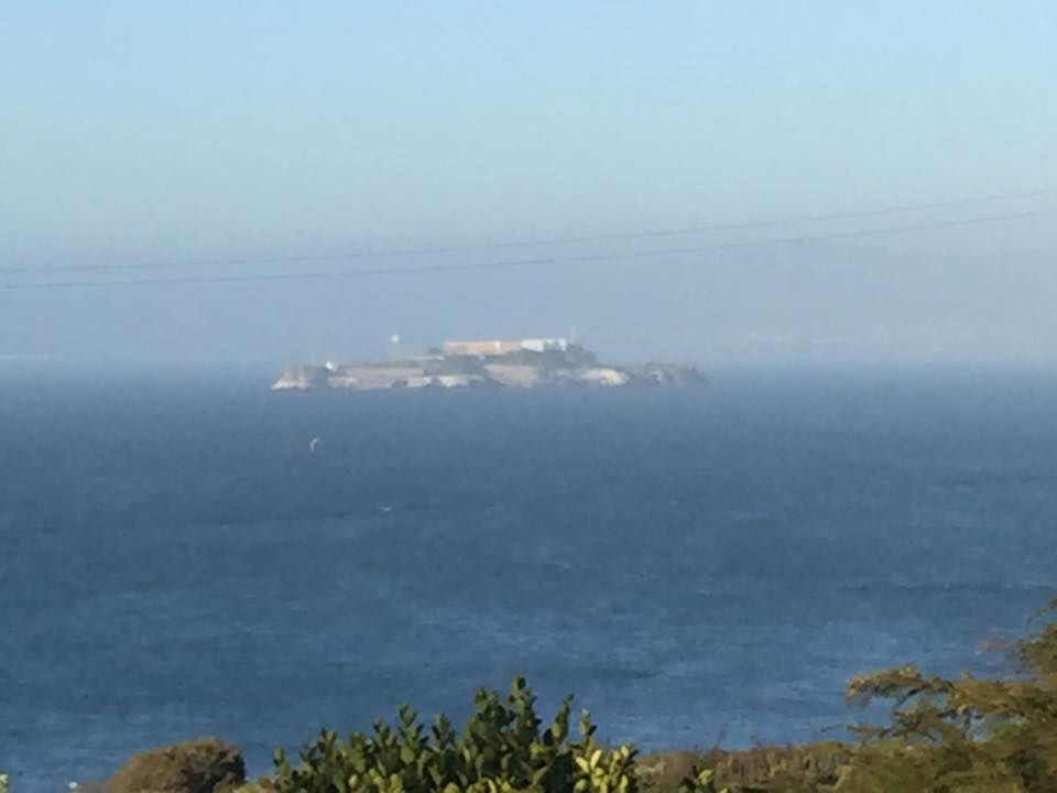 «А это знаменитая тюрьма Алькатрас, расказывал Эркин, показывая рукой на остров посреди залива. В ней сидел знаменитый мафиози Аль Капоне. За всю историю тюрьмы из неё никому не удалось убежать. Километры холодного океана и кишащие белые акулы делают своё дело».