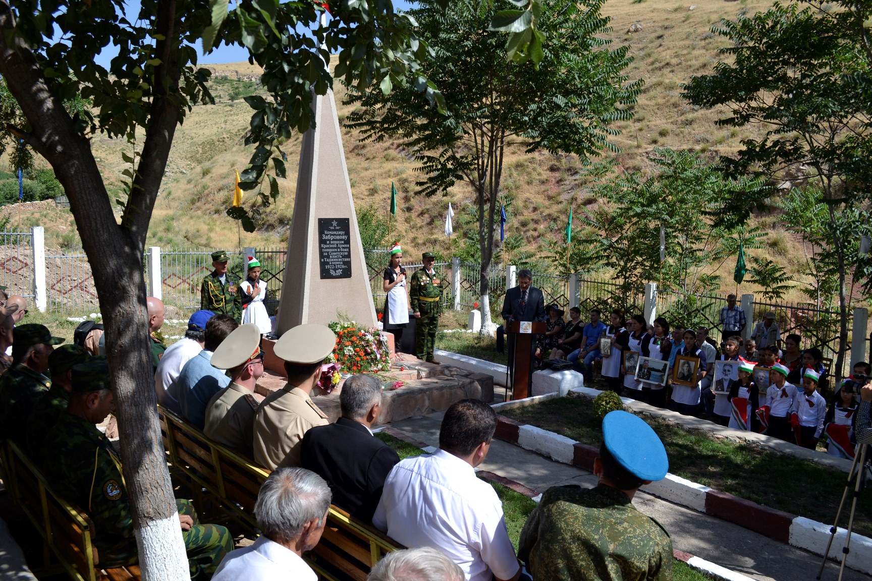 Для справки: Бойцы отряда Забронова погибли в боях за установление Советской власти в Каратаге в 1923 году. В 1964 году на месте захоронения красноармейцев был установлен памятный обелиск. В 2015 году на мемориале были проведены восстановительные работы, участие в которых приняли местные активисты. После реставрации здесь стало традицией проводить торжественные мероприятия, например, принятие школьников в ряды дружины Сомони, воинской присяги военнослужащими, разные памятные митинги и встречи. В этом году мемориал был полностью реконструирован на средства работников Особого отдела ФСБ 201 РВБ.