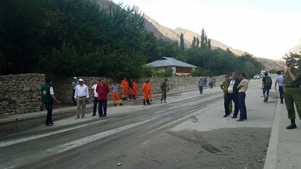 На месте происшествия работают спасатели и техника с целью скорейшего устранения последствий стихии и восстановления движения по автодороге Душанбе-Хорог.