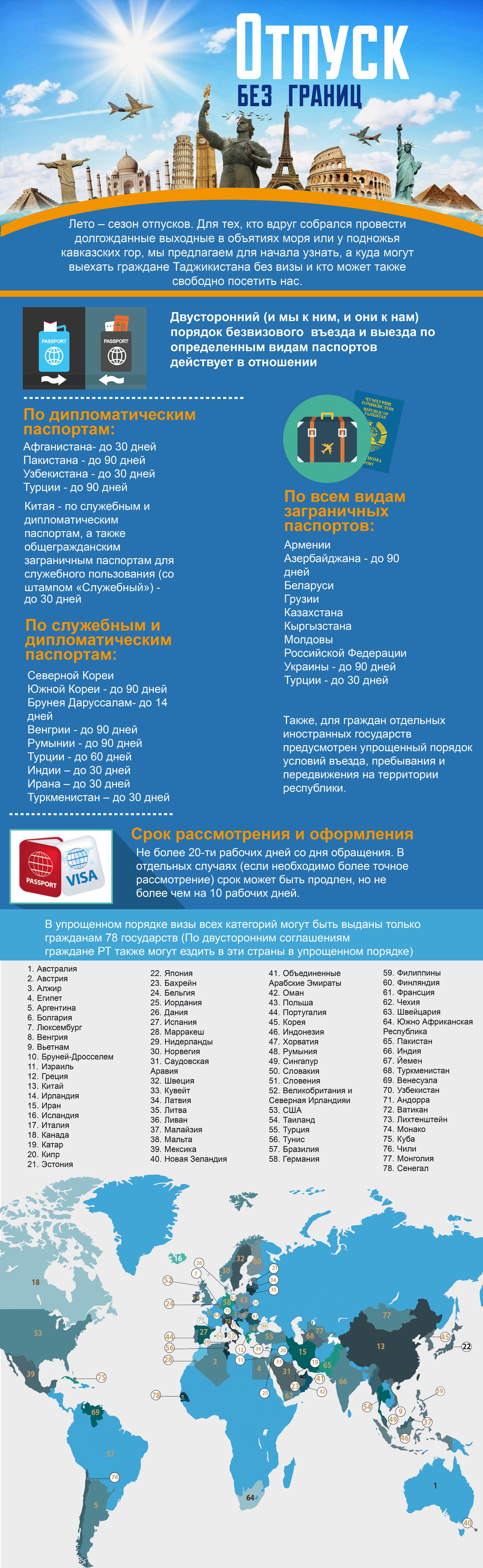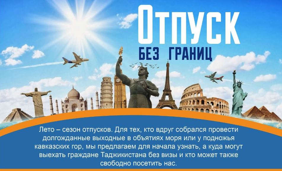 Для тех, кому таки удалось летом вырваться в отпуск и кто уже планирует дальний тур, предлагаем предварительно узнать, в какую страну вас примут без визы. Эта памятка полезна и для иностранных гостей, пожелавших открыть для себя Таджикистан.