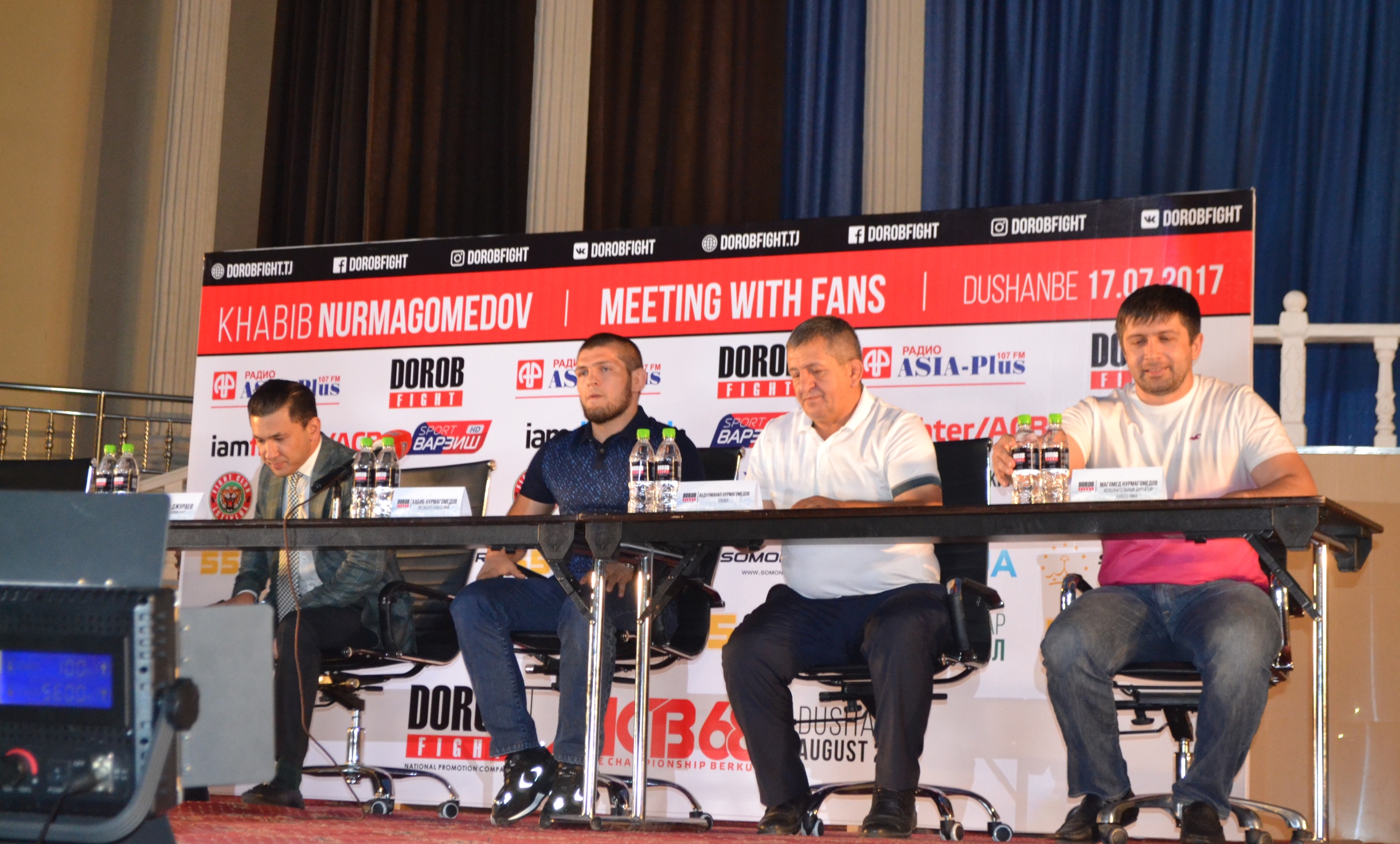 Главное же событие, связанное с визитом Нурмагомедова в Таджикистан, состоялось в понедельник вечером. Долгожданная встреча таджикистанских болельщиков с дагестанским бойцом прошла в здании столичного амфитеатра «Ахорун», где Хабиб и его отец ответили на их многочисленные вопросы. Чтобы увидеть своего любимца, на мероприятие пришло около 5 тысяч болельщиков, но вместить всех желающих было невозможно. Душанбинцы и гости столицы с ликованием встретили одного из лучших бойцов ММА.