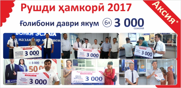 Завершился первый тур Акции «Рушди хамкори 2017» и мы узнали имена победителей. Как сообщалось ранее, на этот раз Банк Эсхата увеличил количество призов, соответственно увеличивая возможности выигрыша.
