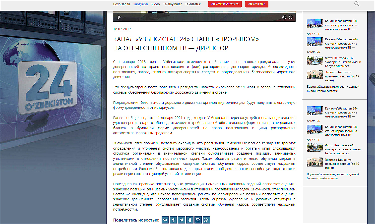 На официальном сайте «Узбекистана-24» доступны онлайн телевизионная и радиотрансляции, а также тексты новостей — с «изюминкой», которая, хочется верить, не станет фирменной для телеканала: