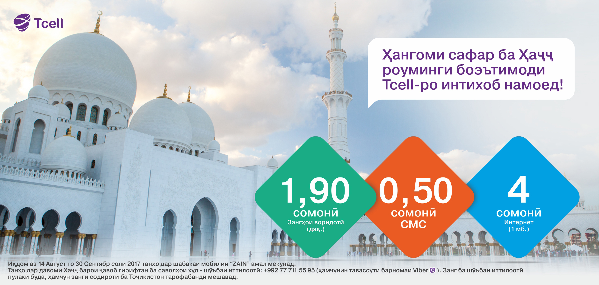 Компания Tcell уже традиционно поддерживает паломников, отправляющихся в Священный Хадж, на протяжении 6 лет, начиная с 2012 года. Tcell предоставляет паломникам возможность не тратить огромные средства в роуминге, совершая дорогие междугородние звонки!