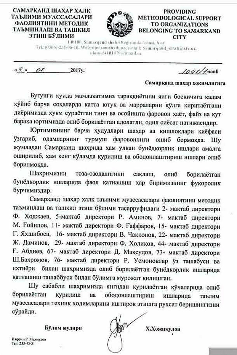 Городским отделом народного образования было организовано письмо от имени директоров нескольких школ, которые, якобы, искренне заявили о желании участвовать «в созидательных работах нашего города». Агентство «Фергана» опубликовала перевод обращения: