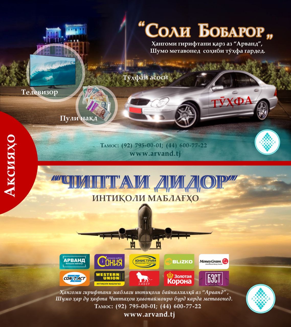 Теперь каждый клиент, получивший международный денежный перевод в ООО МДО «Арванд», становится автоматическим участником акции «Чиптаи Дидор», в рамках которой каждые две недели до конца 2017г. разыгрываются авиабилеты в РФ (туда и обратно).