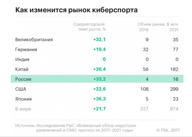 Среднегодовой темп роста рынка киберспорта в ближайшие пять лет составит 21,7%. По итогам 2016 года странами-лидерами, на которые пришлось 81% от общемировой емкости рынка, стали США ($108 млн), Южная Корея ($102 млн) и Китай ($56 млн). В России рынок киберспорта пока значительно меньше — всего $3,8 млн, но прогноз по темпу его ежегодного у аналитиков выше общемирового — 33,2%.