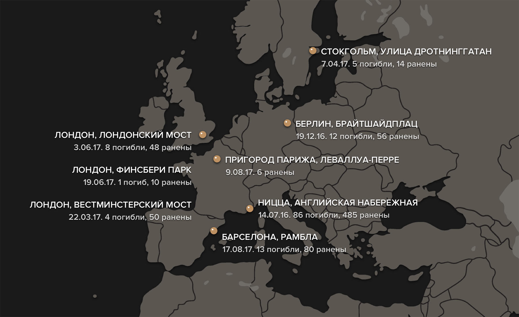 Ранее фургон въехал в толпу людей в туристическом центре Барселоны — в районе пешеходной улицы Рамбла. Полиция назвала инцидент терактом, ответственность взяла террористическая группировка ИГ. Власти Каталонии подтвердили гибель 13 человек, более 100 получили ранения. Среди них граждане более 20 стран.
