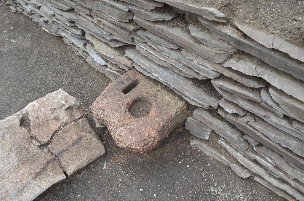 На противоположных концах фундамента арки на крупных плитах выбиты и отшлифованы лунки диаметром 15 см и глубиной 10 см. В одной из них сохранилась железная чашечка с остатками древесины, выполнявшая функцию подпятника (приспособление для опоры оси вертикального вала, – прим. ОА). С противоположной стороны угол плиты сточен – очевидно, от постоянной работы ворот.
