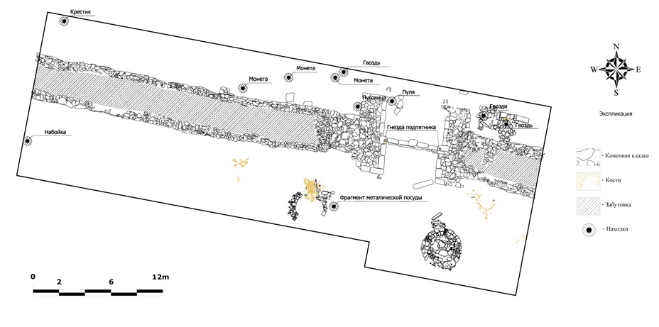– Этот человеческий скелет без черепа был расчищен под каменными завалами. Видимо, был потревожен при разборе стены в XIX-XX веках и перезахоронен на стороне, – предполагает Денис Сорокин. – Из-за почти полного отсутствия погребального материала точно сказать, к какому периоду относится скелет, не представляется возможным. В данный момент кости обрабатываются антропологами. Результаты анализов будут отображены в итоговом отчёте за 2017 год.