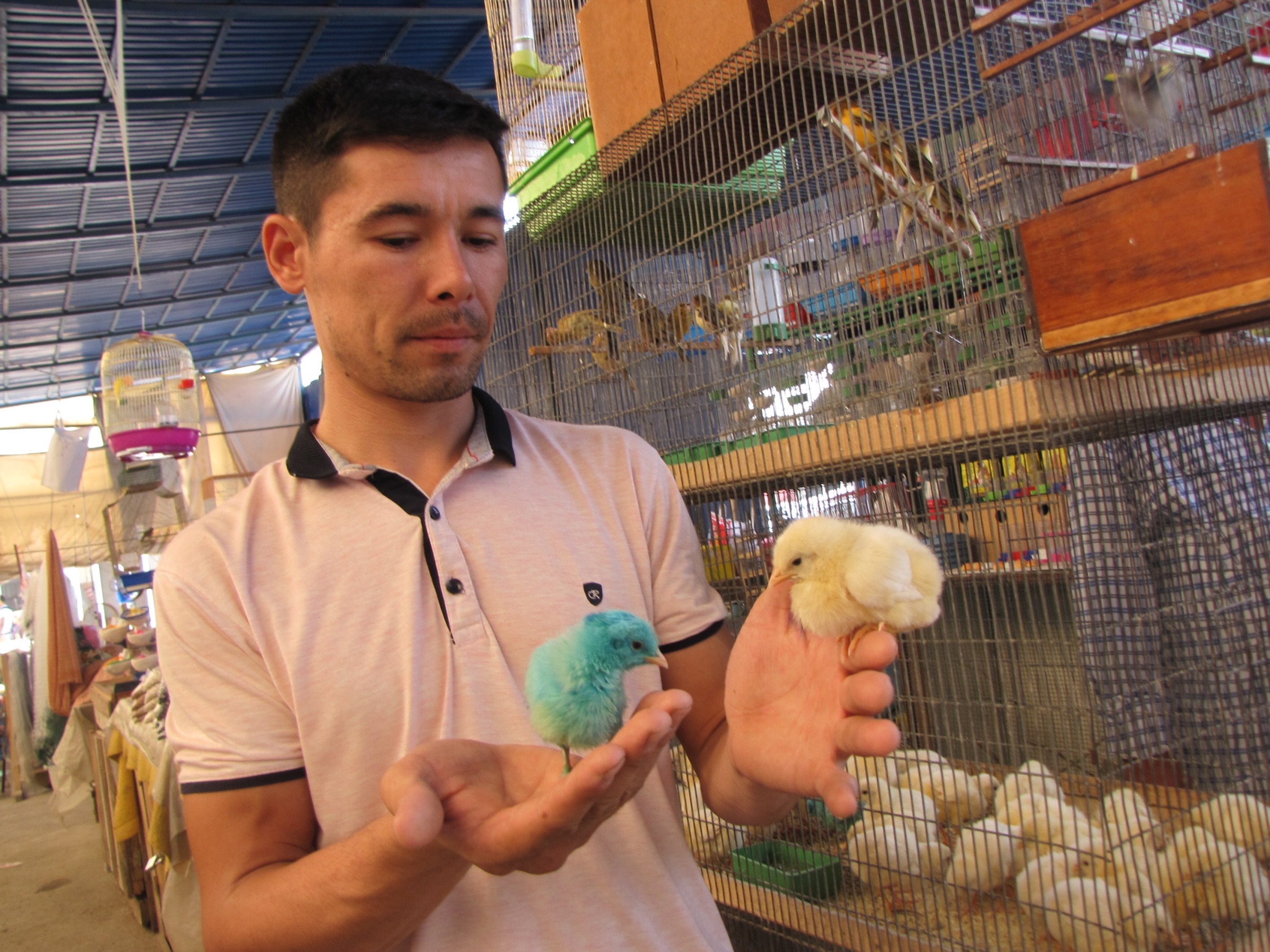 Любитель птиц, житель города Худжанд Тохирджон Холматов искал и нашел способ привлечь внимание потенциальных покупателей его цыплят. Он просто решил их разукрасить в яркие цвета. На экзотику повелись.