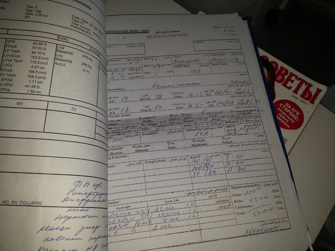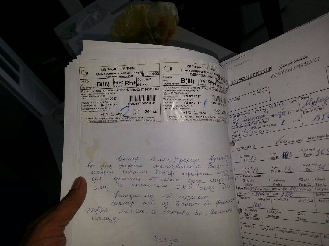 «Я получаю лечение в частной клинике Ибни Сино, так как, когда у меня случился очередной приступ, врачи в Караболо (РКБ №3) отказались от лечения, — пишет женщина. — На один сеанс гемодиализа в этой клинике необходимо 1200 сомони, но так как мы уже третий год там лечимся и у нас больше нет возможности оплачивать за лечение, нам снизили стоимость до 750 сомони».