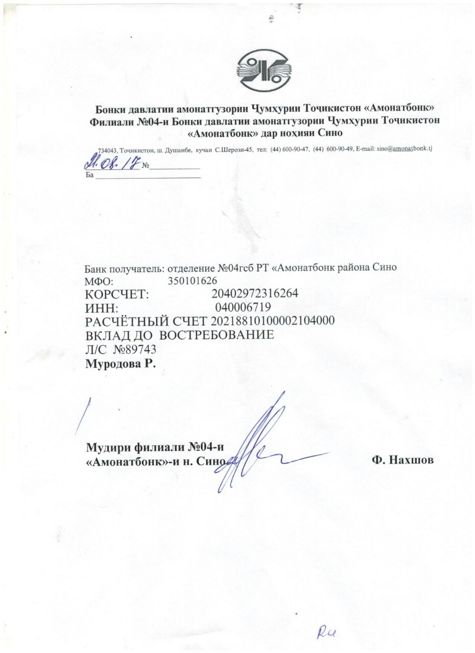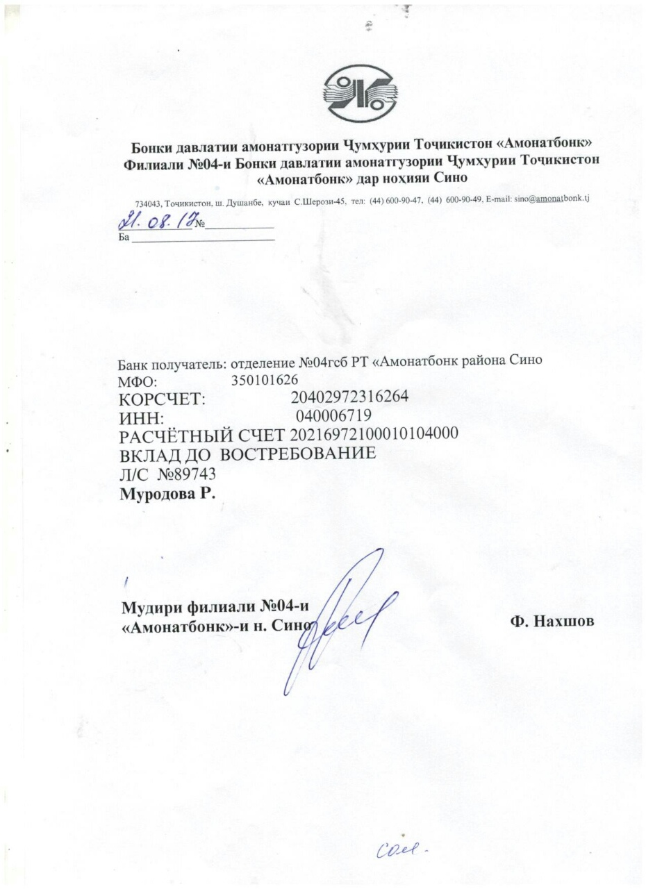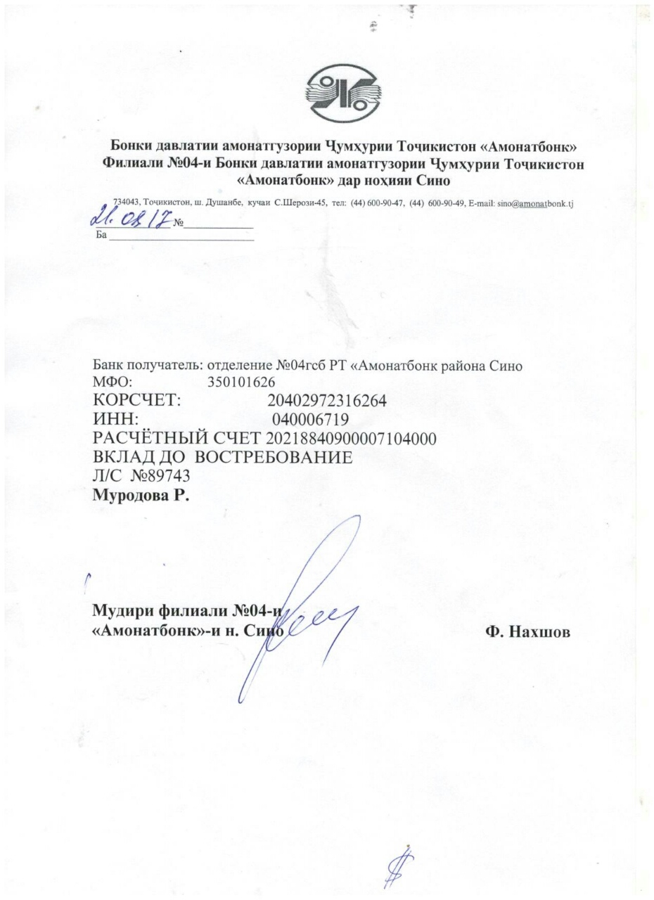 Реквизиты в сомони, в российских рублях и долларах прилагаются.
