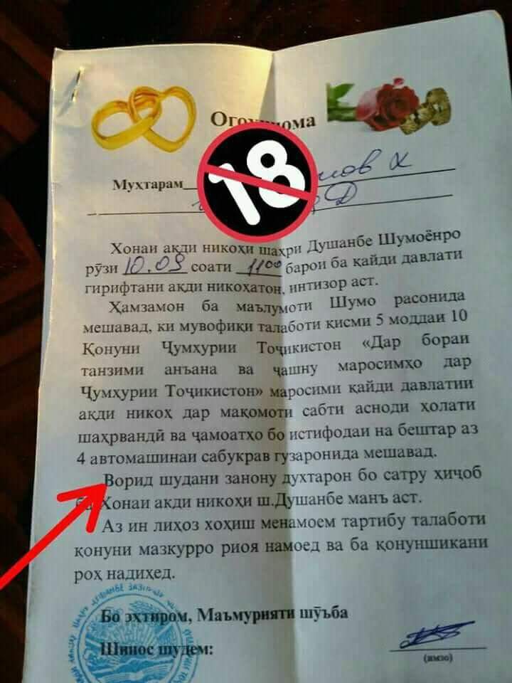 «Женщинам и девушкам в хиджабах и сатрах запрещено входить в здание Душанбинского ЗАГСа в соответствии с частью 5 статьи 10 закона “Об упорядочении традиций и обрядов”. В ЗАГС молодежены должны приехать на четырех машинах, не более», — говорится в приглашении для молодых людей, которые должны зарегистрировать свой брак 10 сентября.
