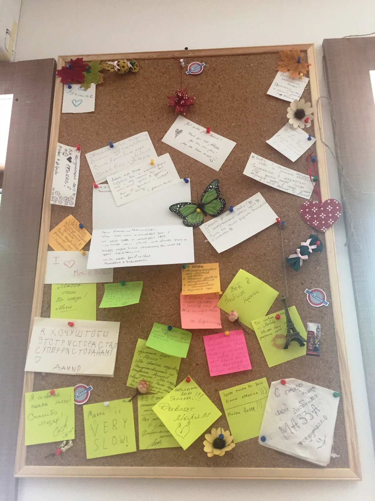 Заходим в первое попавшееся нам модное столичное кафе «Мазза» и просим администратора показать жалобную книгу. Молодой человек подводит нас к доске, усыпанной стикерами с испещренным мелким почерком.