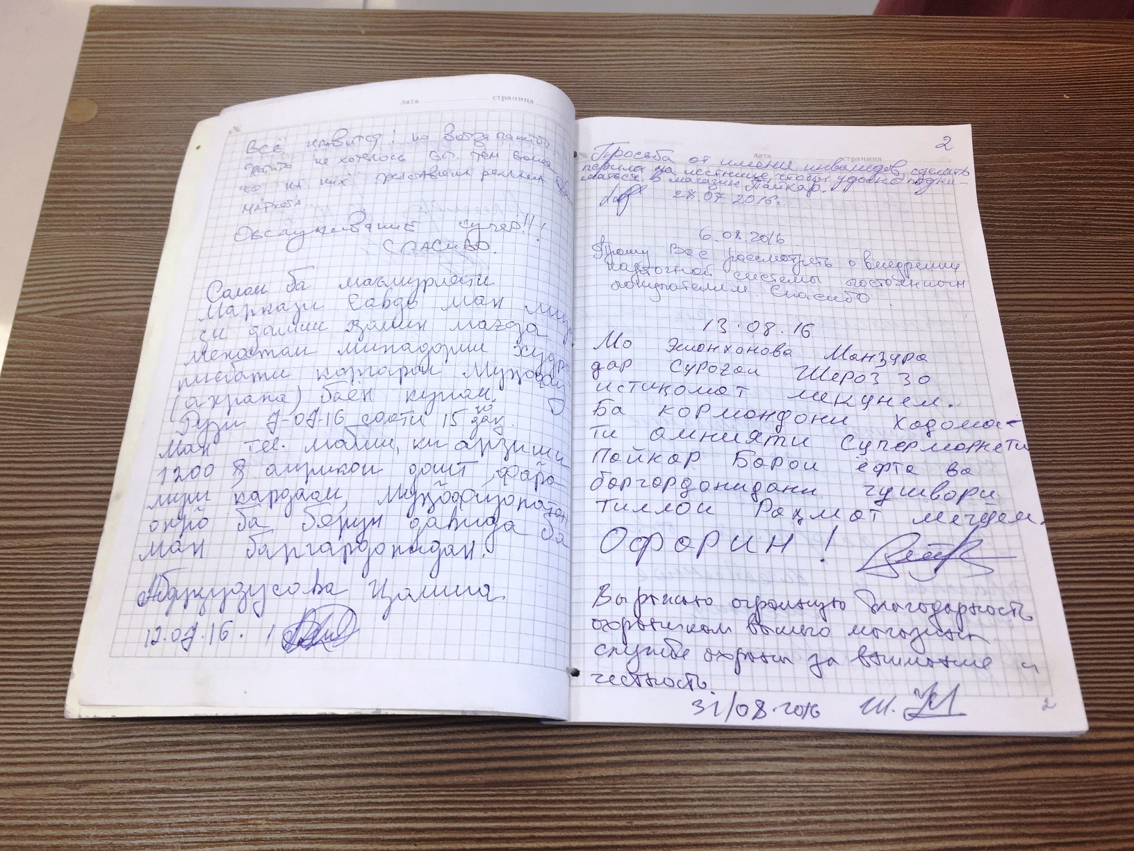 Далее — столичный супермаркет «Пайкар». Здесь «Книга отзывов и предложений» находится на самом видном месте. Однако нас снова ожидало разочарование. Книга представляла собой обычную общую тетрадь в клетку, оформленную по собственному воображению администратора супермаркета, не соответствующую порядку ведения инструкции о «Книге жалоб и предложений».
